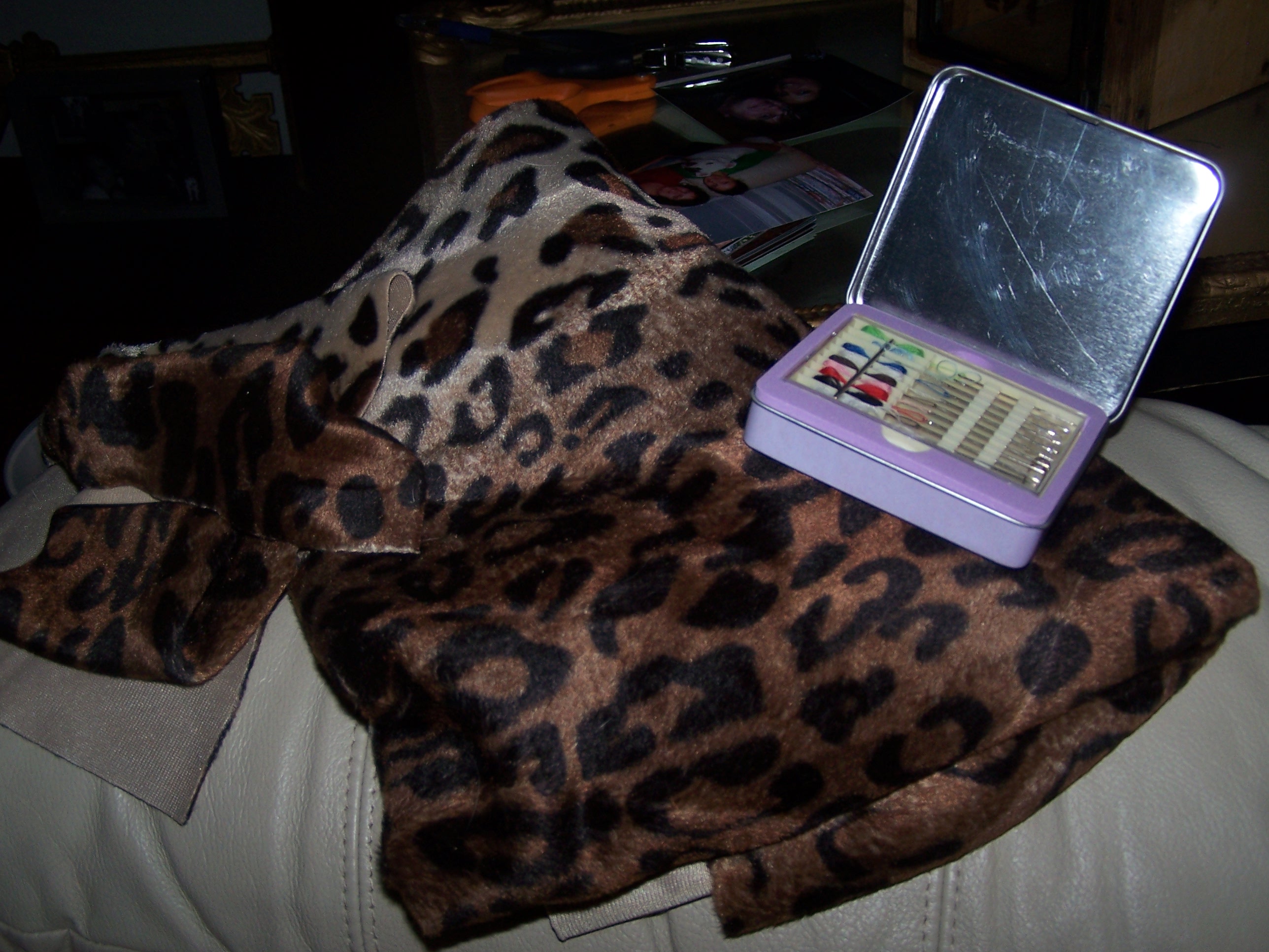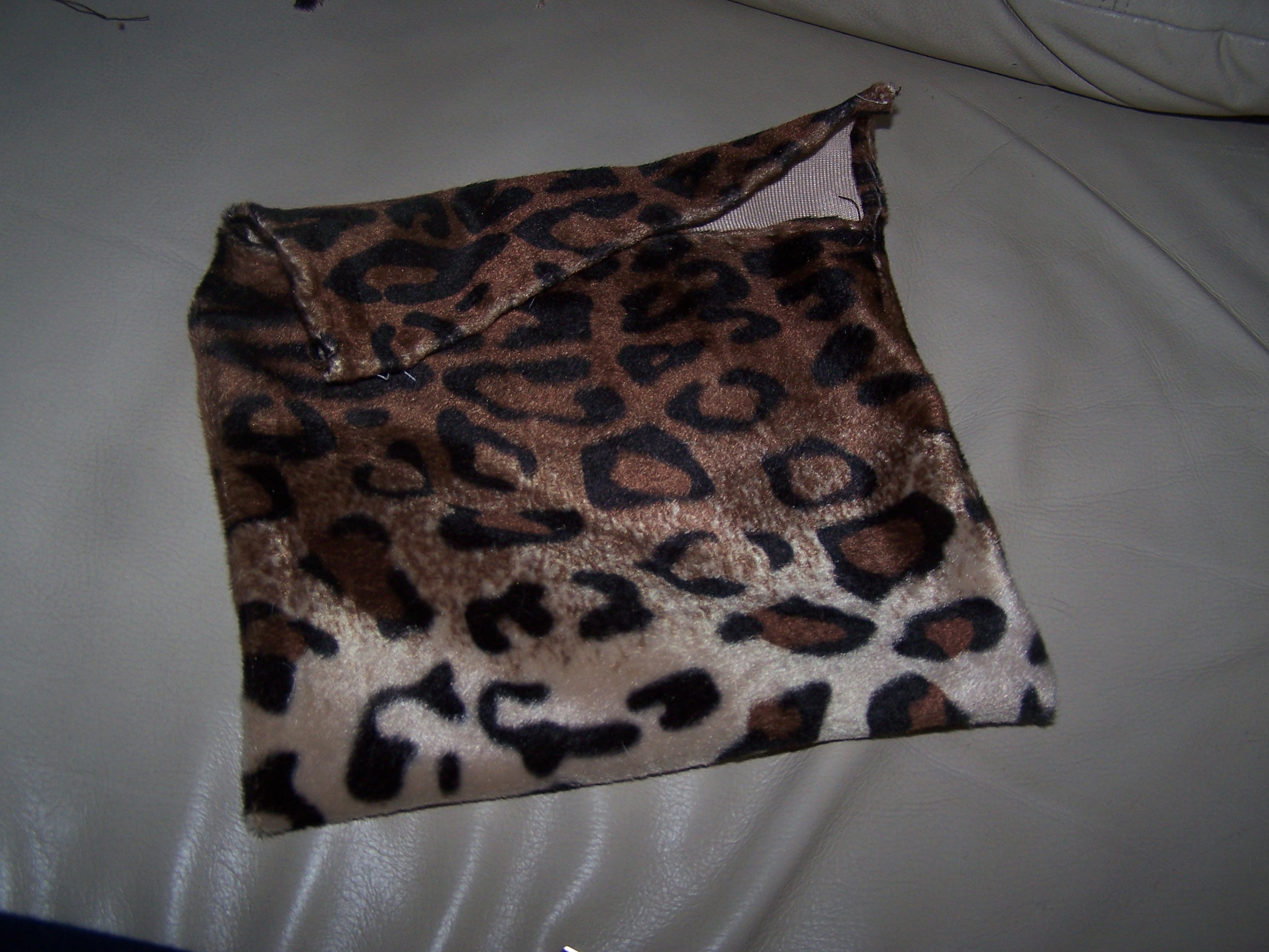 I used a rectangular strip of some soft leftover leopard fabric that I had lying around the house. I folded it in half with one end a few inches longer than the other, with the leopard print facing each other (inside out). I sewed the sides together next. Then sewed a seam on the extra top flap of material. Once the sewing was done I flipped it inside out and added a bit of Velcro to keep the top flap closed. That simple!