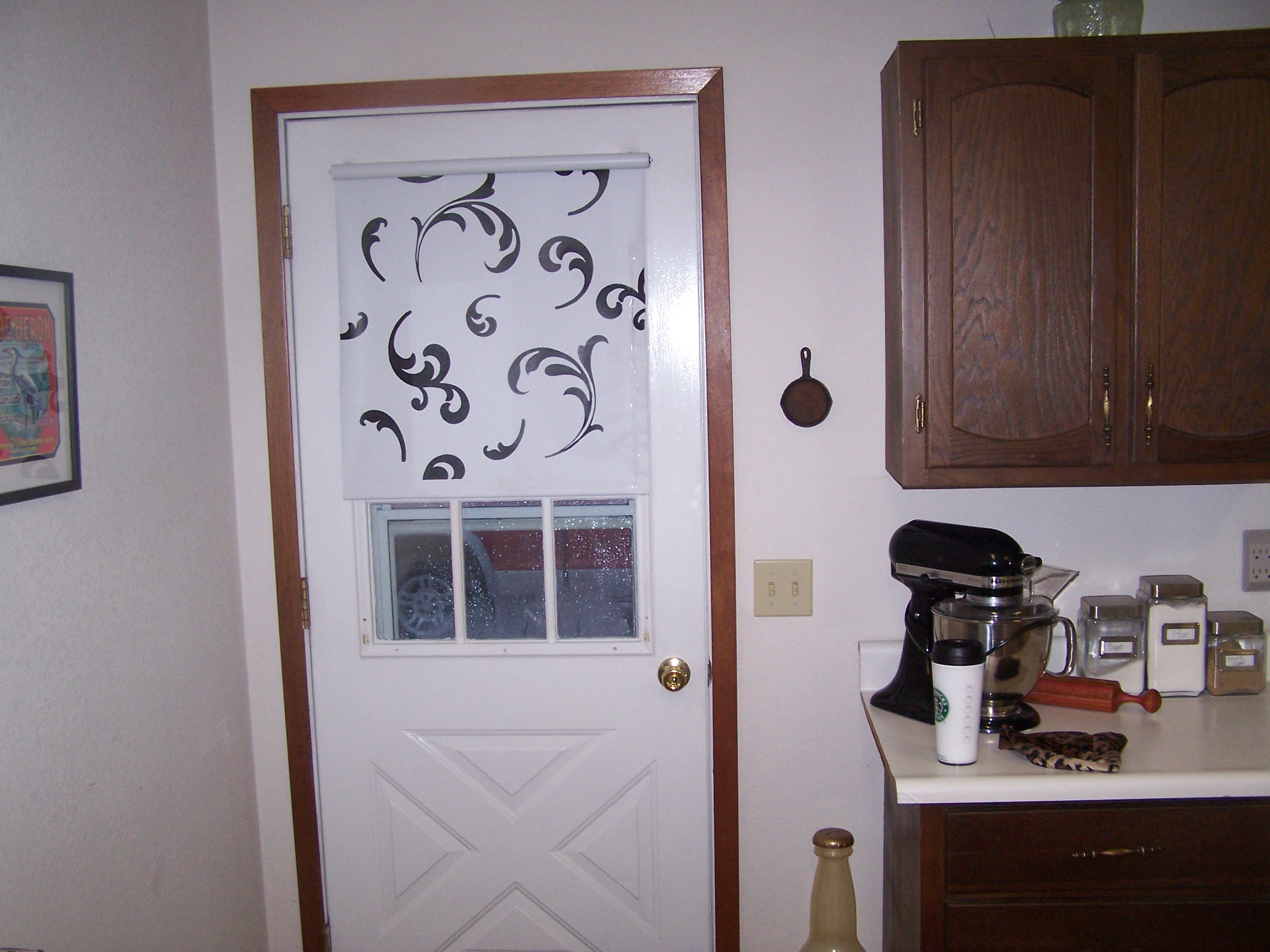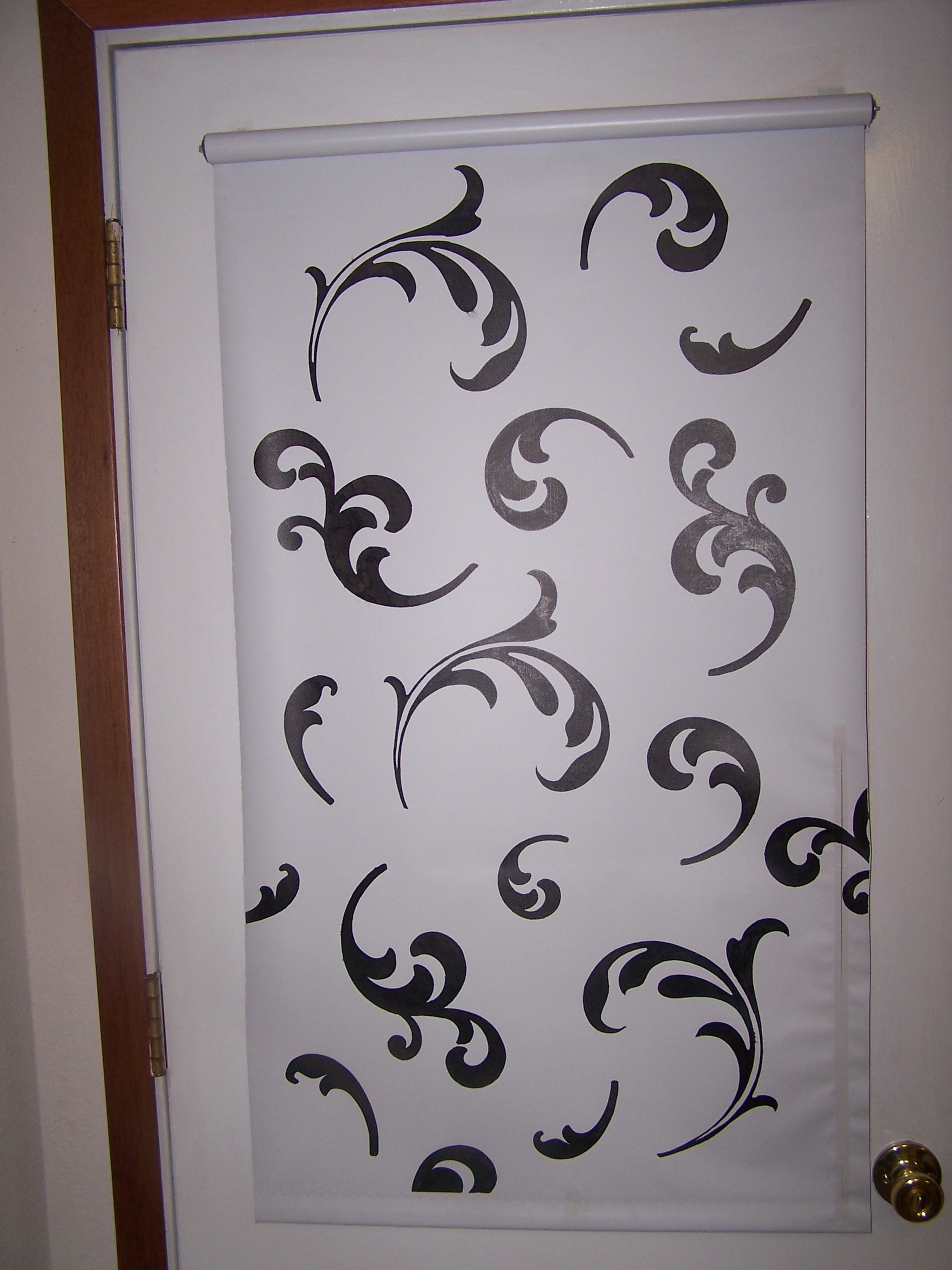 I thought I would start off small. There was no shade over the large window in our kitchen door. Our neighbors could see right in! I decided to take the old white roller shade from the dining room door (since it also has a curtain) and refinish it to go in the kitchen. I wanted to stick with the black and white theme. I used some swirly scrap-book stencils I had and a paint pen ($3 at Wal-Mart). I laid the stencils out where I liked them, traced, and colored in. Now, viola!