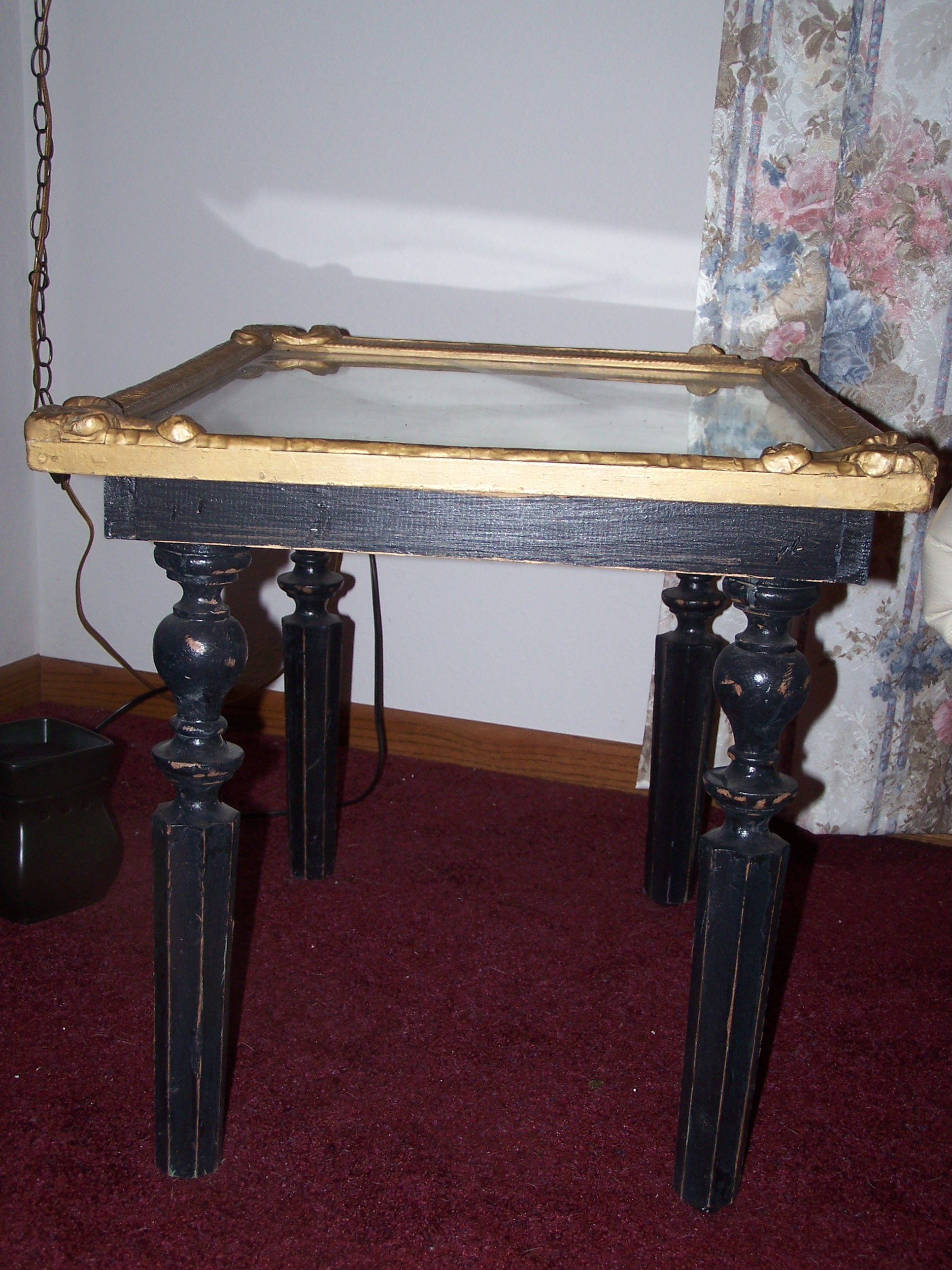 This is an old table with an antique frame used for the top. We use it as our living room coffee table. It has its dings and scratches, but I think that's what makes it so unique.