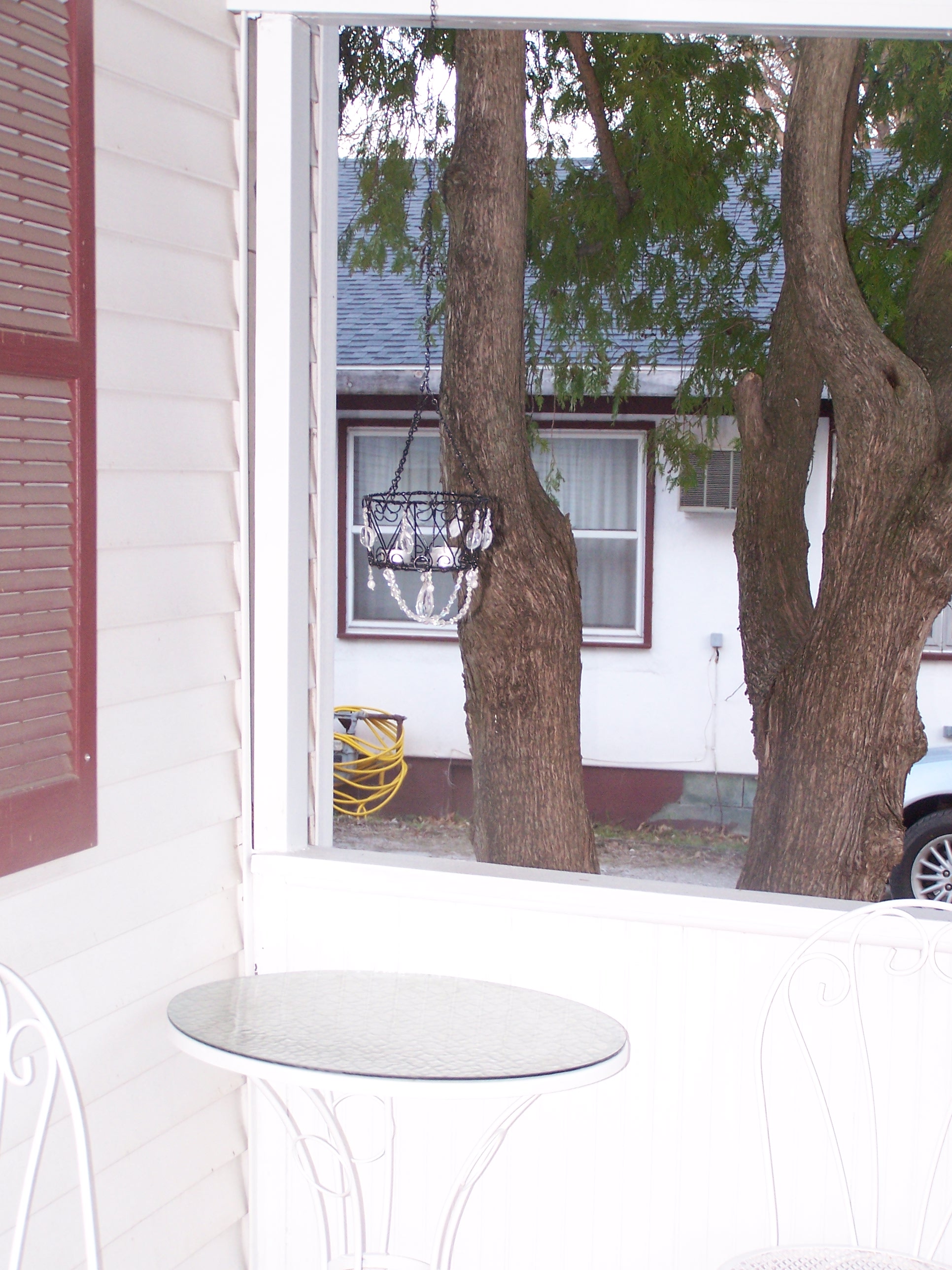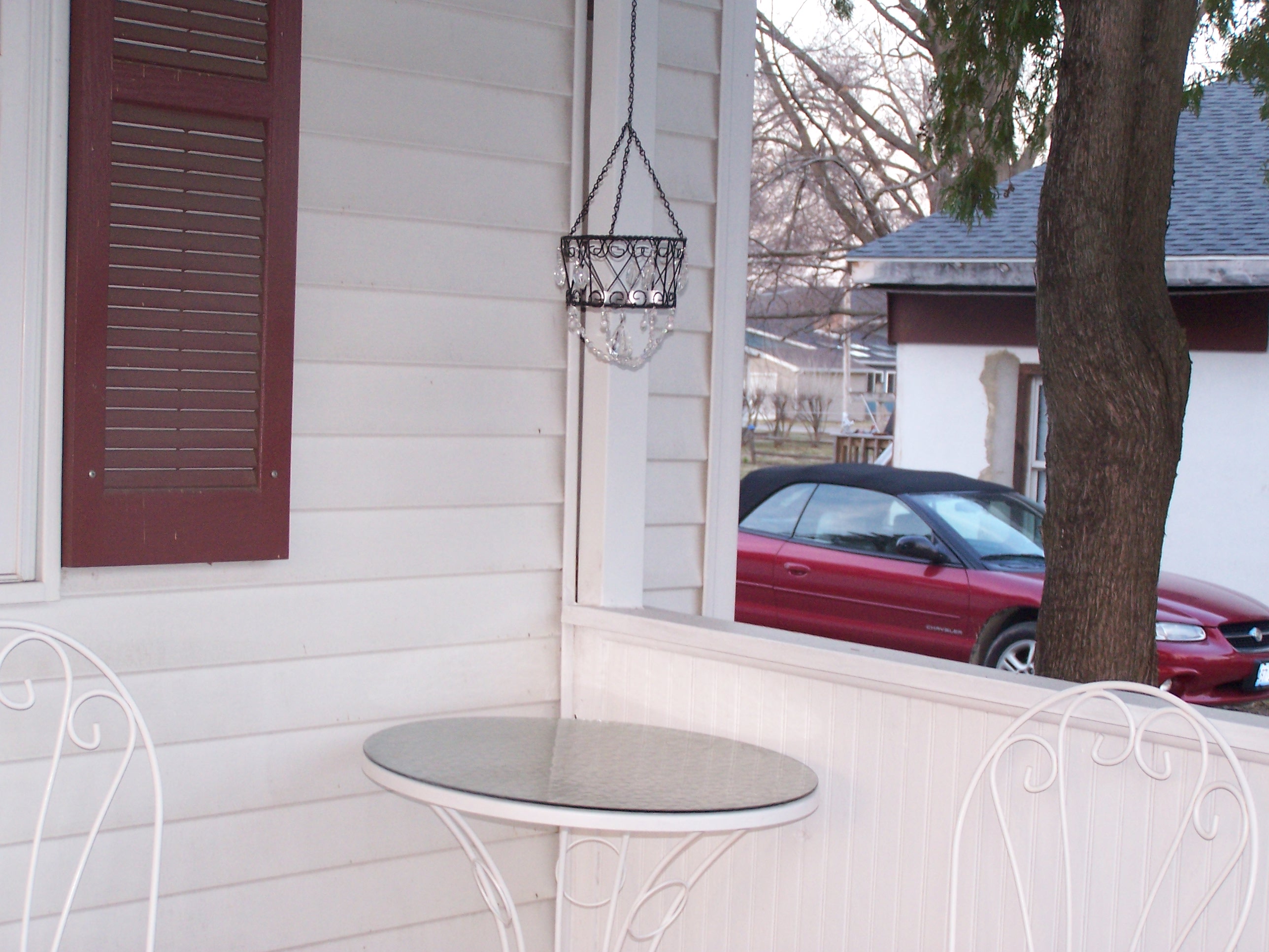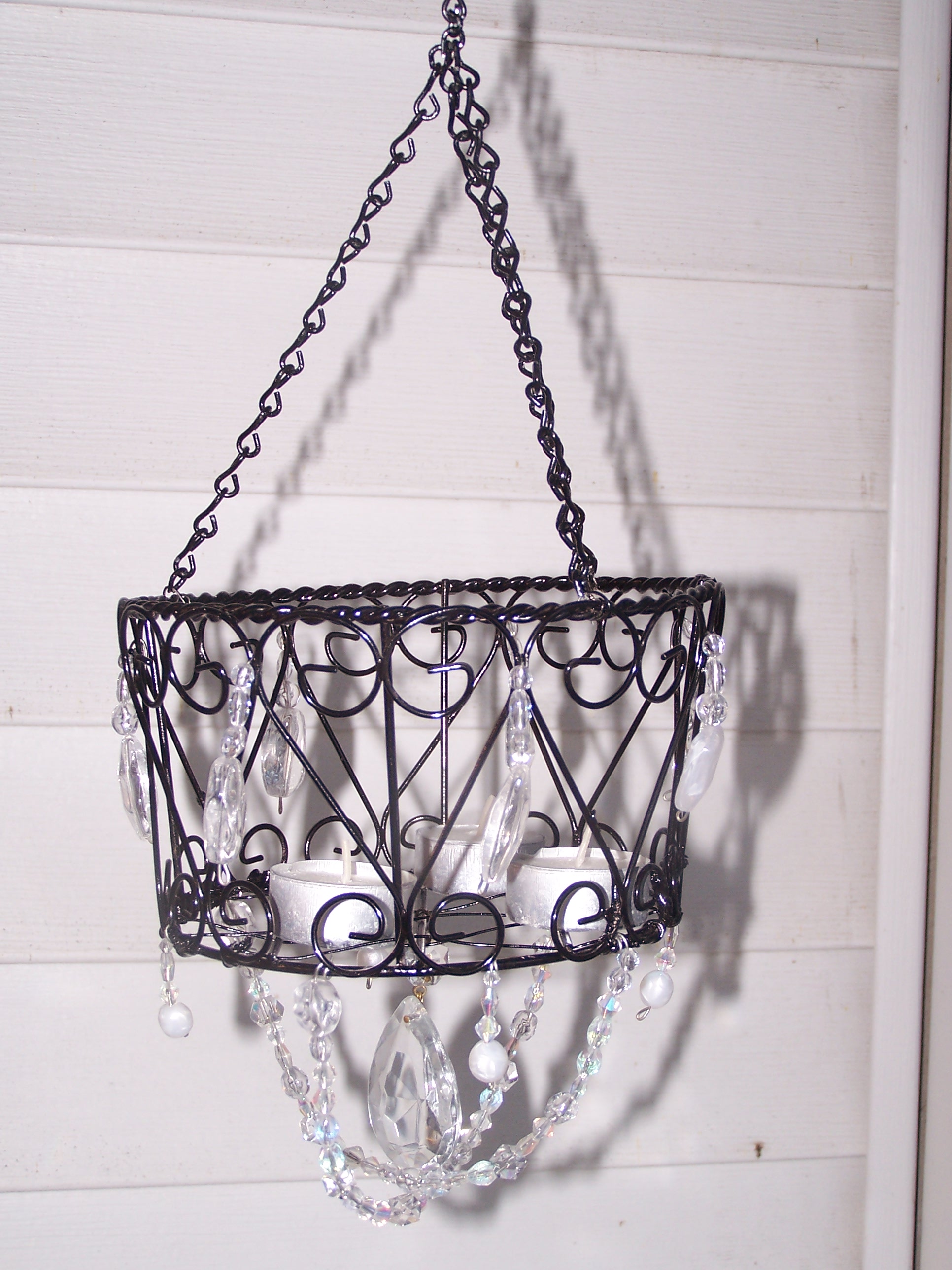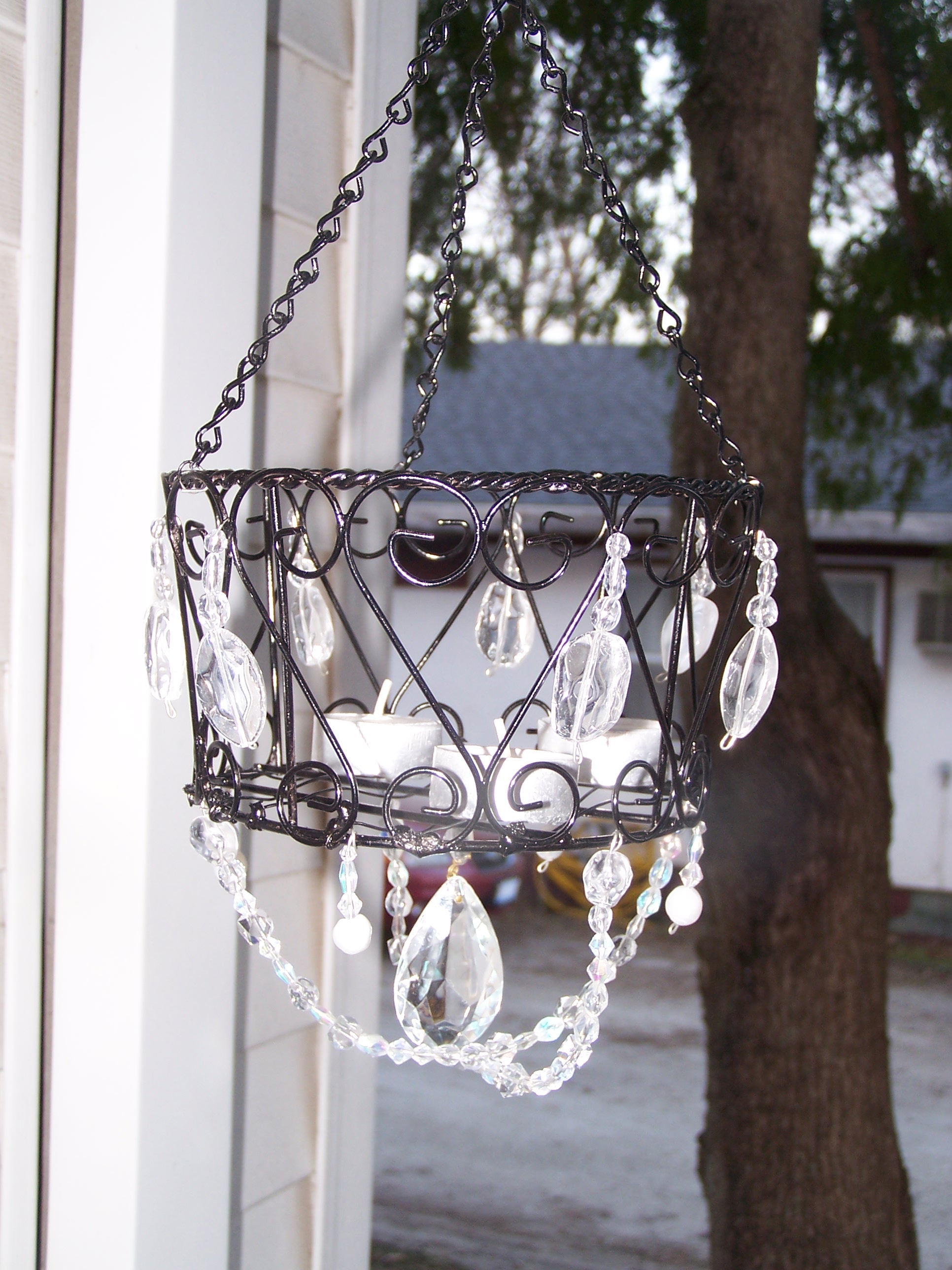 I took a 75cent basket from the Salvation Army and spray painted it black. I hung crystals and beads on it and added a length of chain. I added some mini candles in jars and viola! We now have a chandelier above the ice cream table on the porch! I found this idea on Apartment Therapy and think its super cute. What do you think?