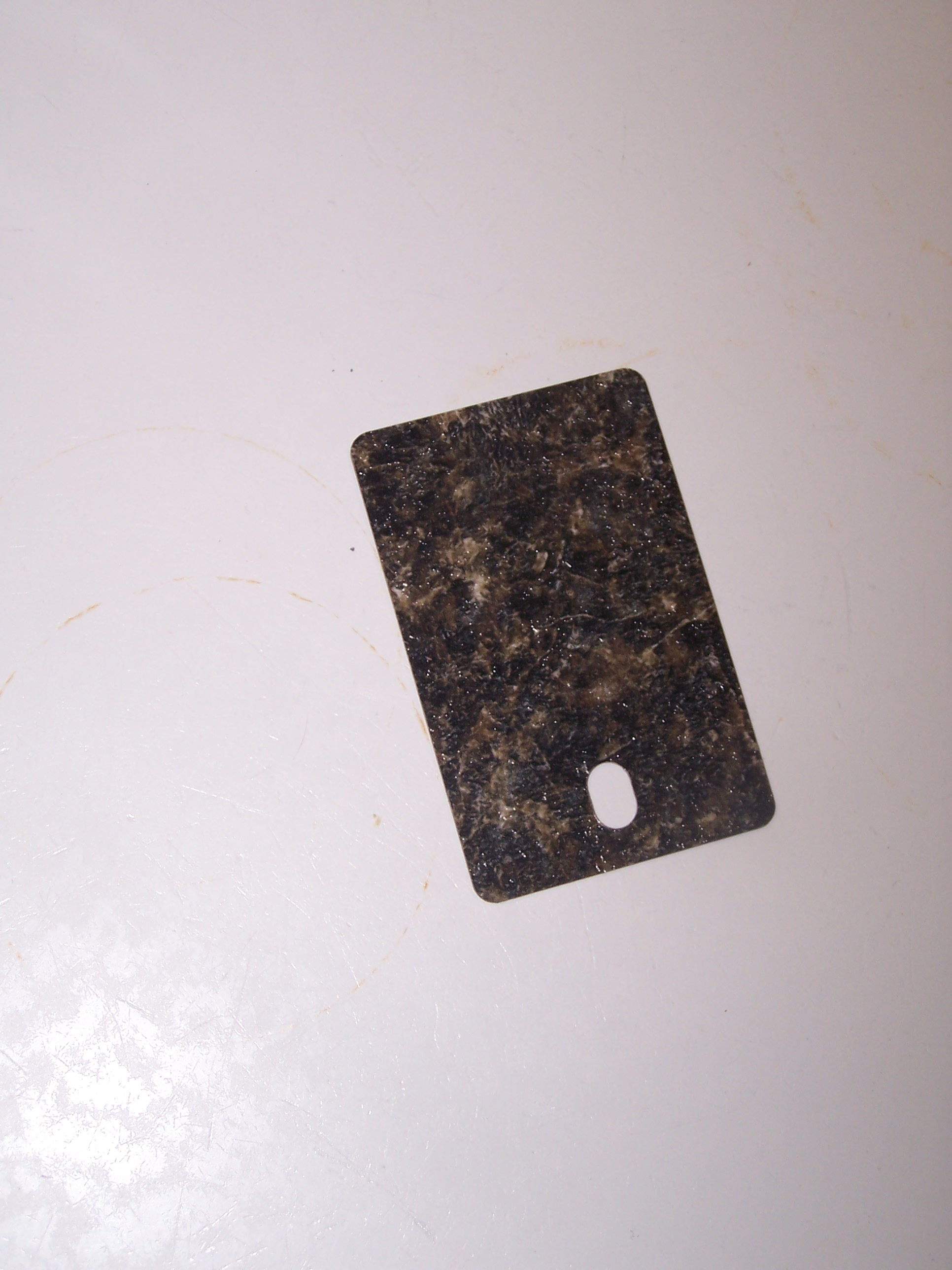 So, I guess I should have, but I didn’t plan for the unexpected road blocks when finishing the kitchen. Like, accidentally buying a couple too few hinges! It is done, but not picture ready. So I have one more sneak peak for you until then. Here is the sample card for the counter-tops we are getting. I originally wanted pure black, but there is no standard laminate in pure black. I picked black because it was to look like slate. Laminate is, unfortunately, what we can afford right now. So, this was the most black laminate we could get. It is probably going to look like marble. This may be great to some, but I am concerned it is too far from my original vision. Will it look to country? It does tie in the browns from the floor and the white from the cabinets. It will take about two weeks to get them in since they are extra long… so please, ease my mind until then! No, really, give me your true opinions!