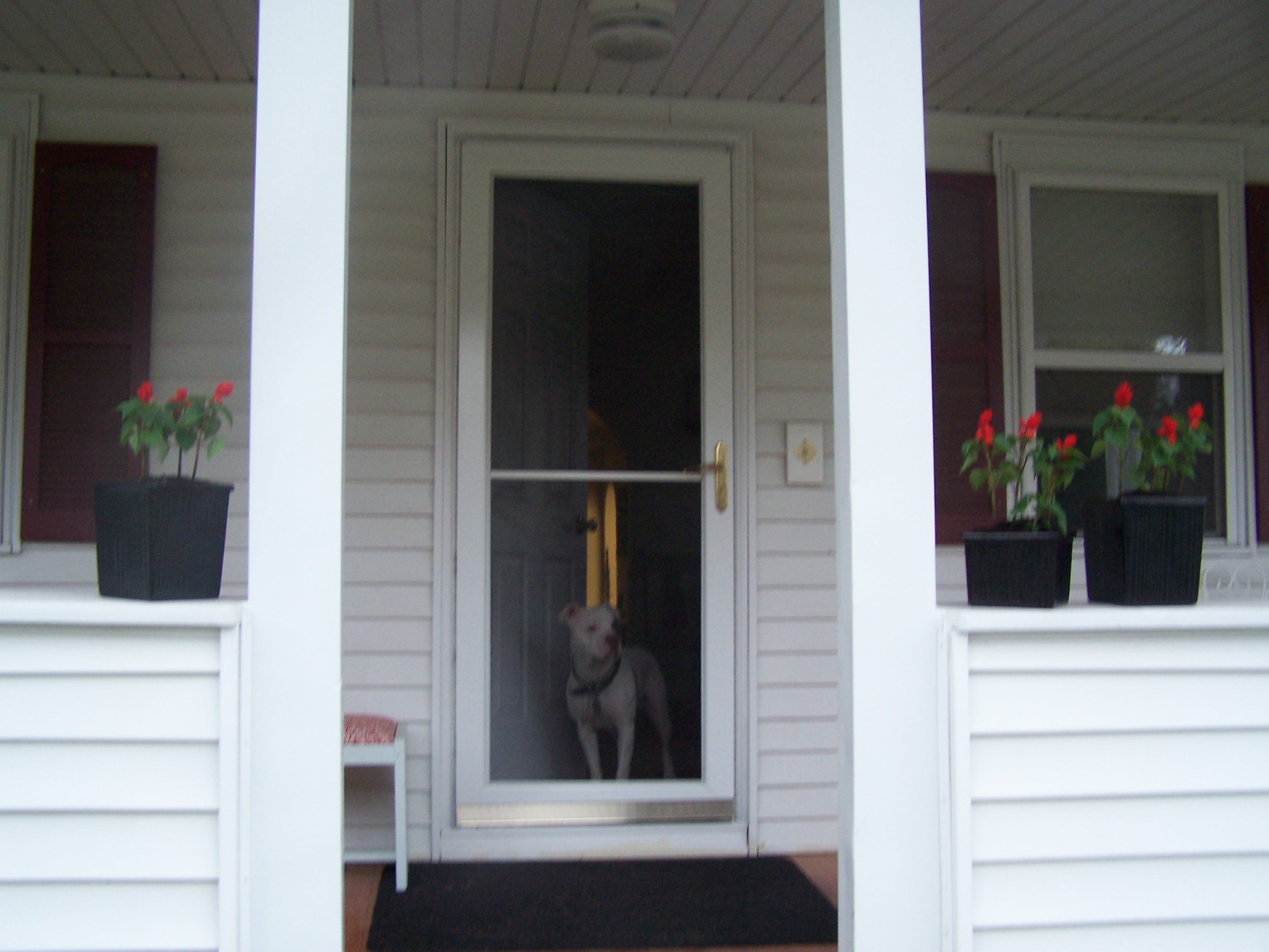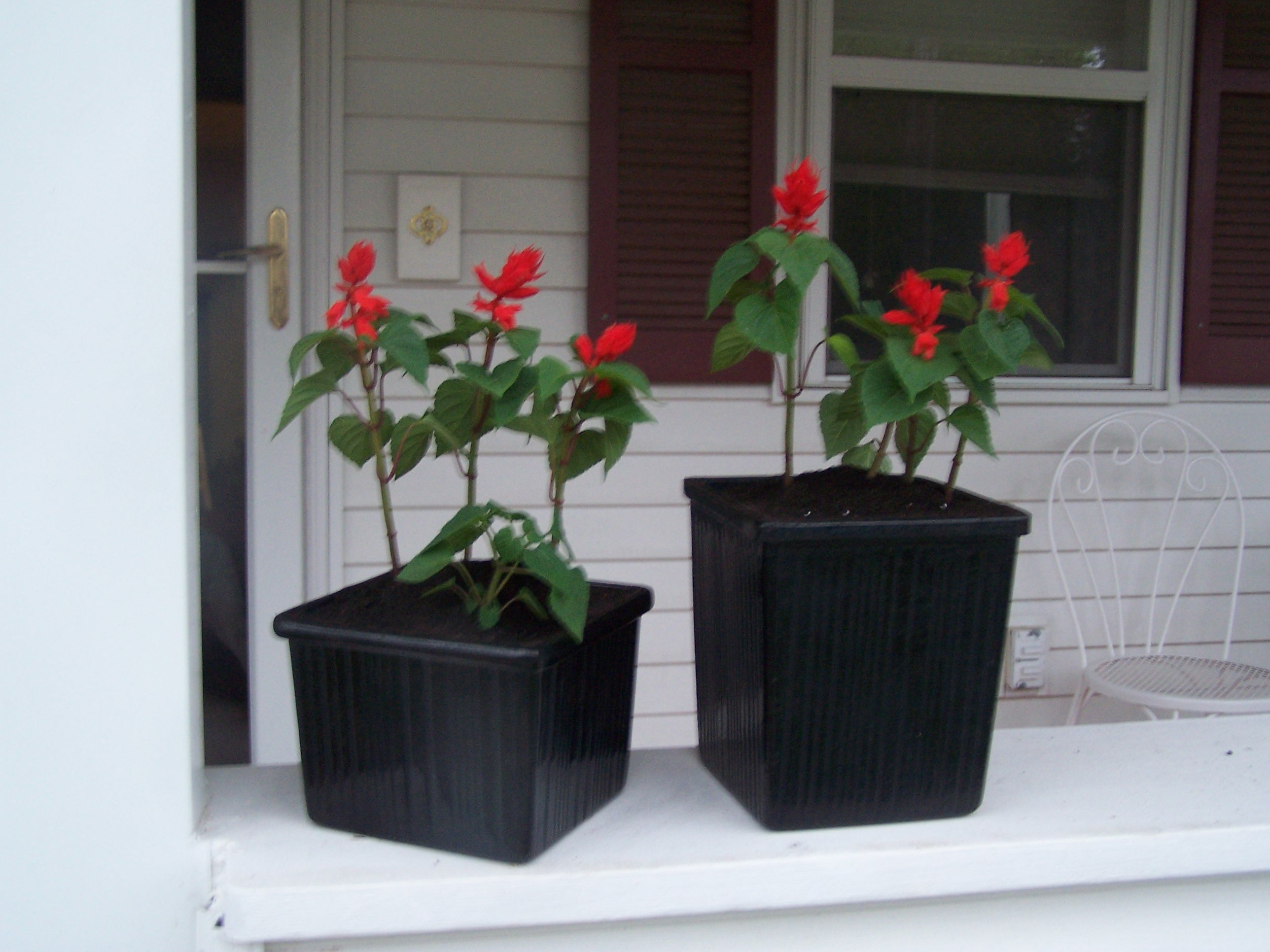 Last night I picked up a few inexpensive black, square pots for a few flowers for our porch. I think they (although small) brightened up the front porch and made it at least look like someone lives there! We also hung a strawberry plant in the corner, where it can get a lot of sun. (Again, sorry for the dark, rainy pictures!)