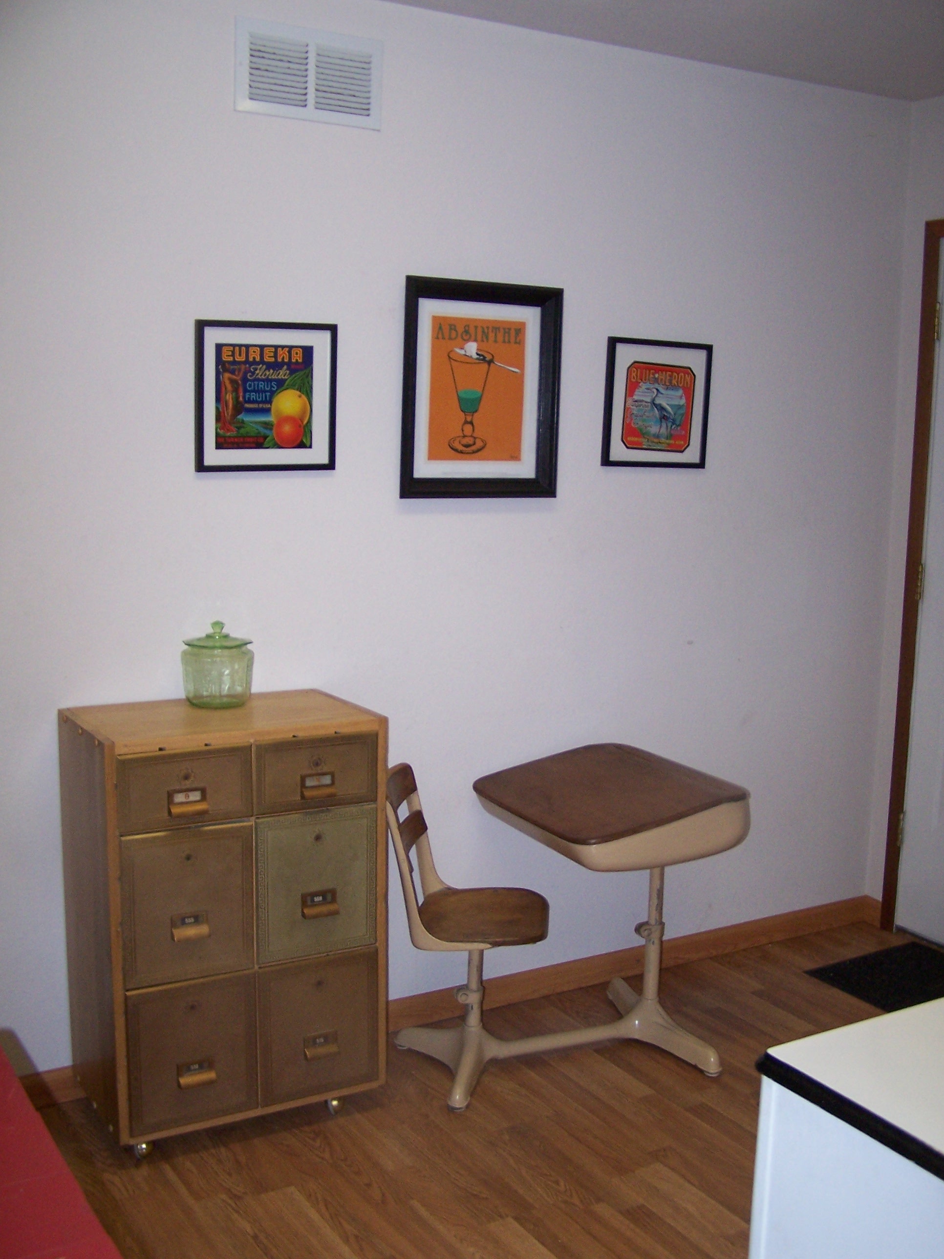 I’m not sure if the school desk should stay now or not. But, for now, this is what the area looks like. Suggestions?