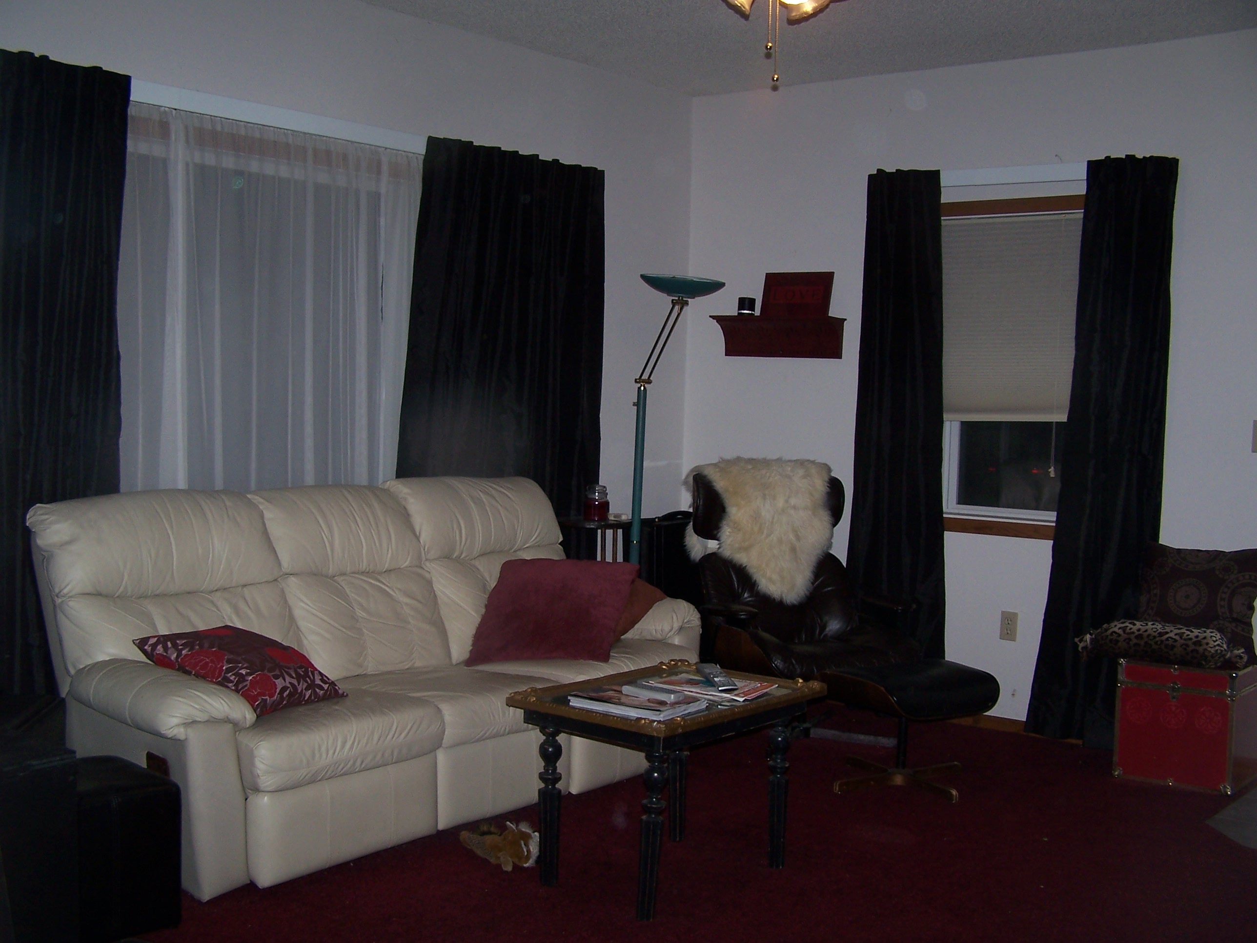 I’m not too sure about the new curtains we chose, so I need your opinions and suggestions. They are, no doubt, better than the before, but not exactly what we had in mind. We wanted to stay inexpensive for right now, so we got these at WalMart (no Ikea near us!). We originally picked a charcoal color, but when we got home we realized that the packages we grabbed were all black! They do need some steaming, but here they are: