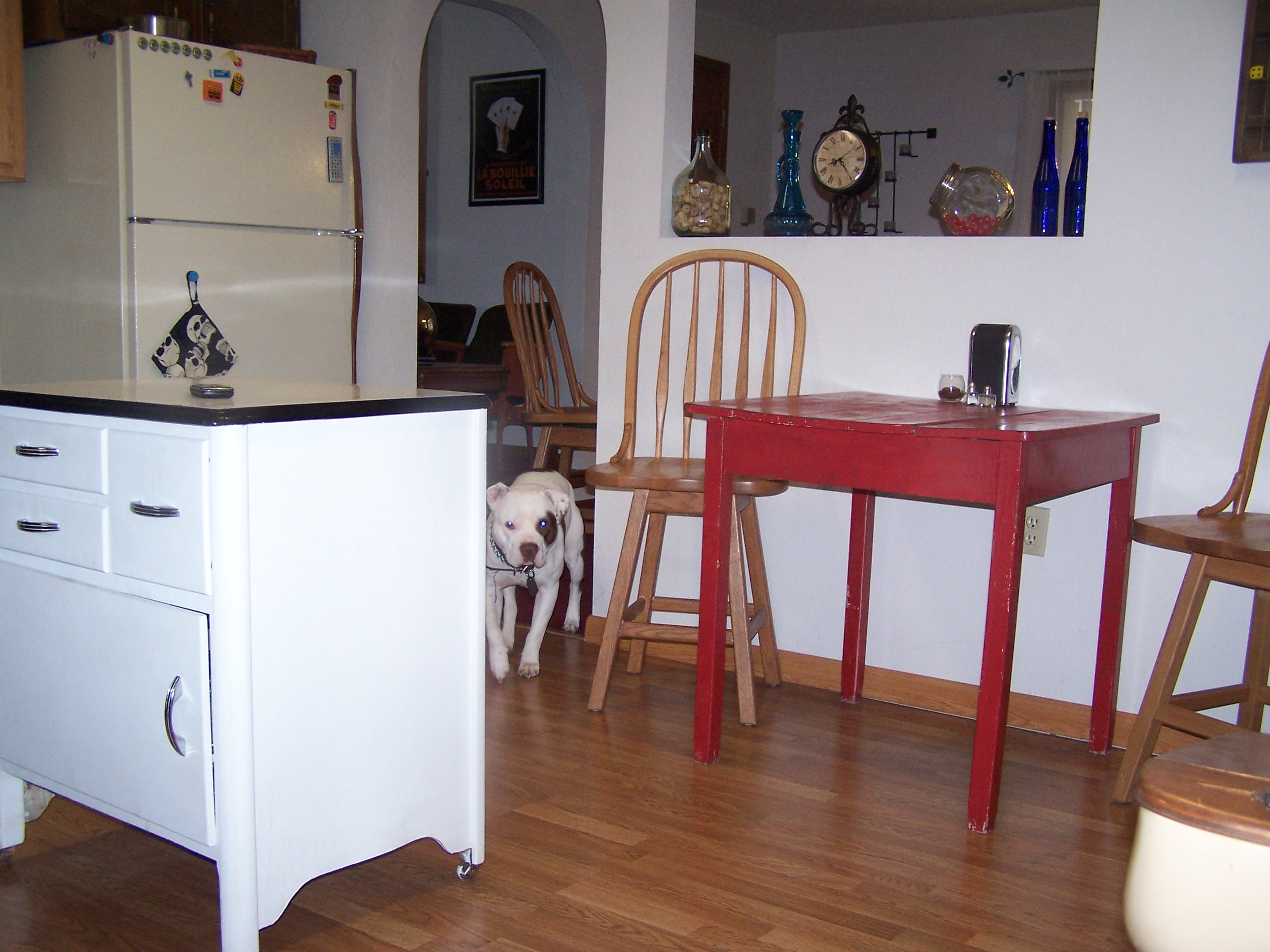 While I was there I also spotted an antique, claw foot, drop leaf table. Hmmm… We got to thinking. We have been wanting a bigger table for the dining room and decided to try moving the red table to the kitchen. After giving the rooms some rearranging we fell in love. Here’s the kitchen: