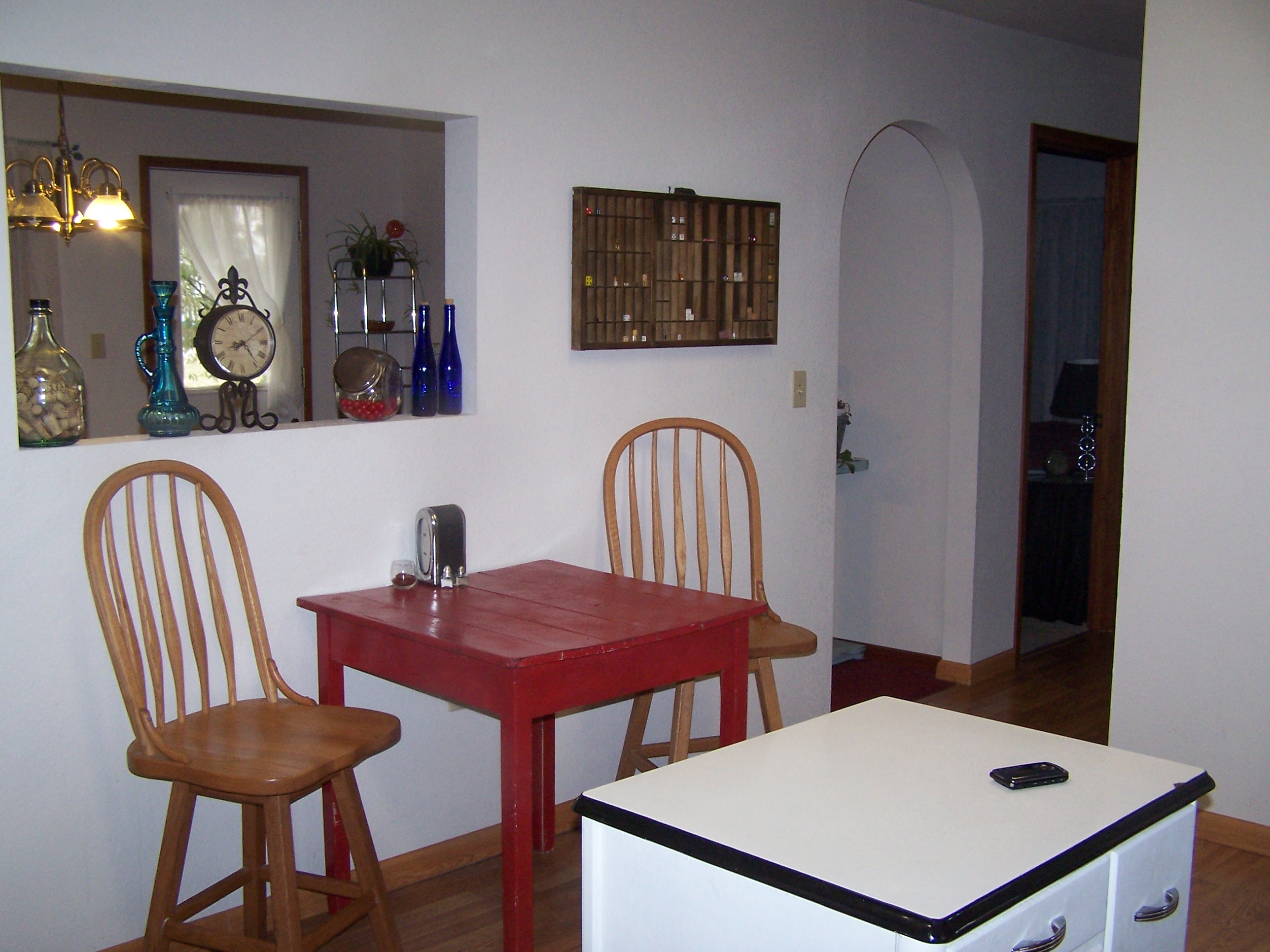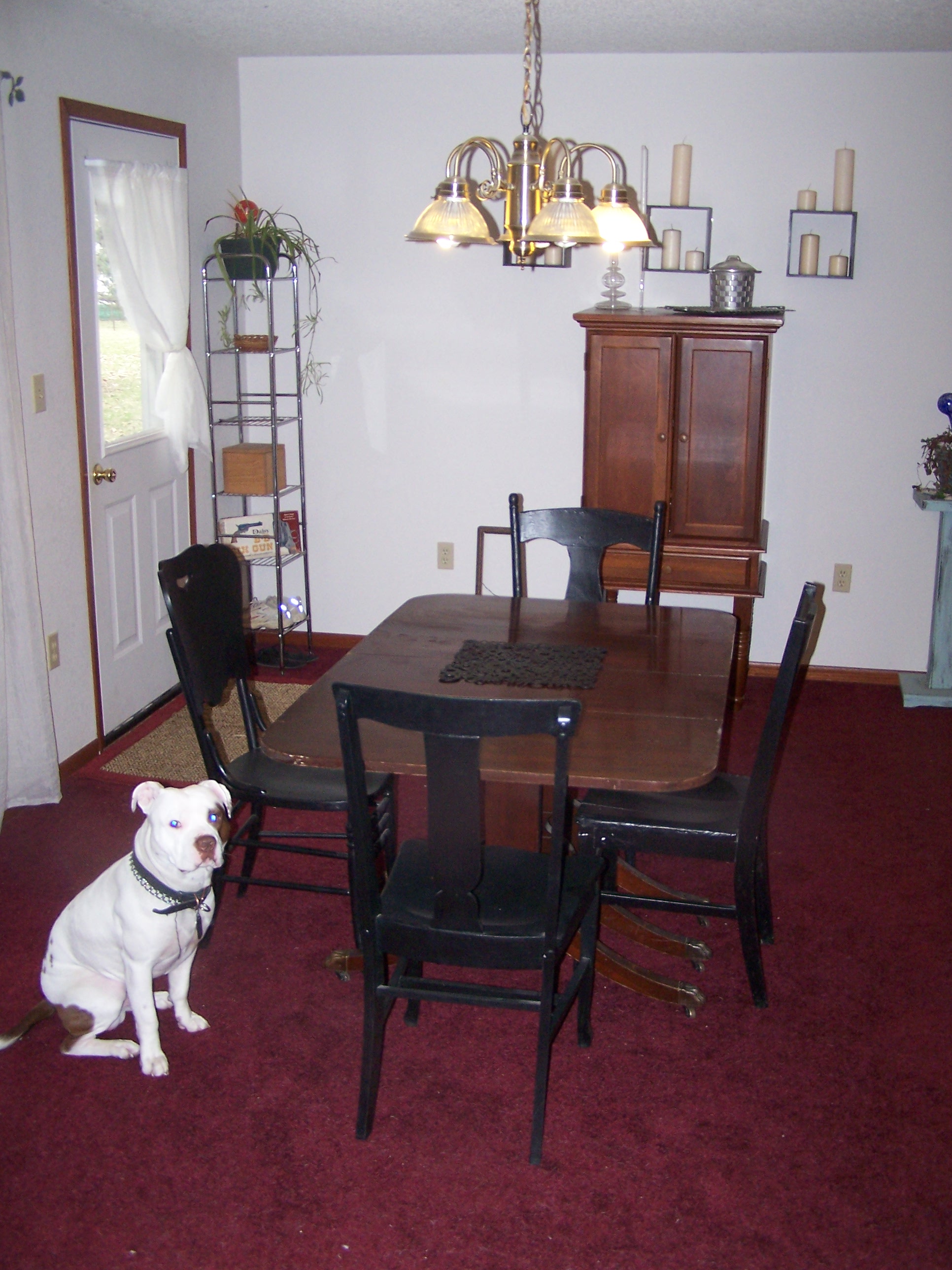 It feels so nice and cozy in there now. We even sat here yesterday morning and had coffee together. So, after giving the new arrangement a night we decided it was a keeper. I headed back to the D.A.V. and snatched up the dining table. We got a great deal, but it does need some work. I removed some scuffs, but there are scratches. We are probably going to cover it with a table cloth until we get some other projects finished and then start stripping and refinishing it. We are thinking of staining it either a lighter brown to match the maple bar or black like the desk that is still in progress. I am still hung up on my mis-matched chairs, and am in the process of adding a few different styled ones, so although it doesn’t match perfectly right now it will when we get done! Bonus: I found out that the table expands for adding leaves! Although it didn’t have the originals with it we can make some for it to have big family meals here! 🙂 Here’s the dining room: