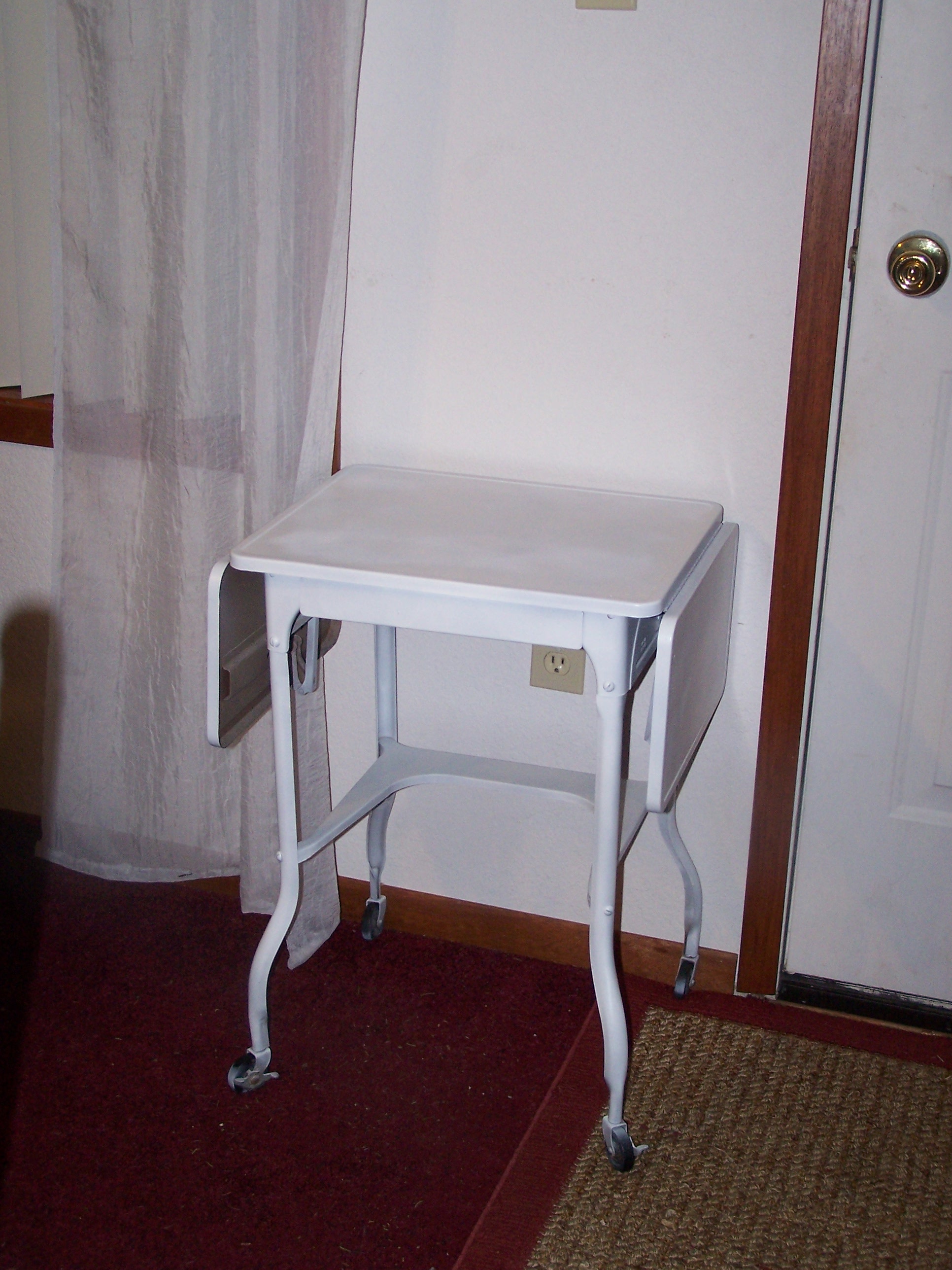 We have been busy busy. It all started with a quick stop at the D.A.V. (Disabled American Veteran’s) thrift store. I happened upon a cute little vintage typewriter table for $3.95! I love the metal industrial look, so I couldn’t resist. It was just a bit dirty and scratched, so we painted her white. With one more coat and a small black swirl on top (this weekend) this beauty will sit next to the door to the backyard in the dining room. It is on wheels and easily movable, so it will serve as an outdoor drink table as well. We have been searching for something to go outdoors while enjoying grilling or the bonfire, and nothing seems pretty but built for the outdoors. This way we can just bring the little table in when we aren’t out there. Here she is: