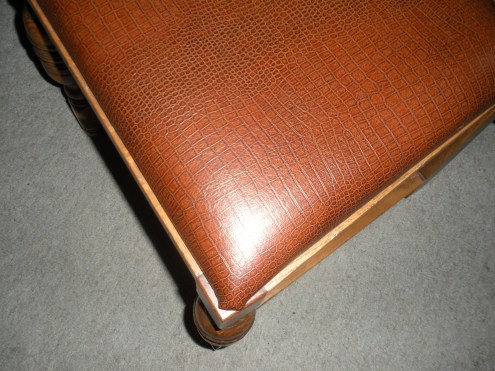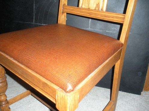 Mom has gorgeous antique wood dining chairs. But, the cushions were reupholstered many years ago, and are now raggedy and faded. So, we bought so printed leather and I set to work.
