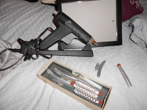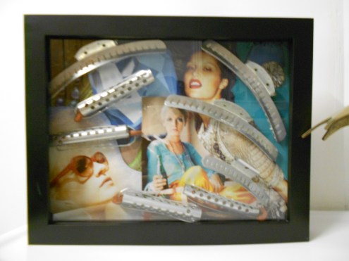 A little hot glue, some magazine cut outs, scrap book paper, and a basic shadow box frame…