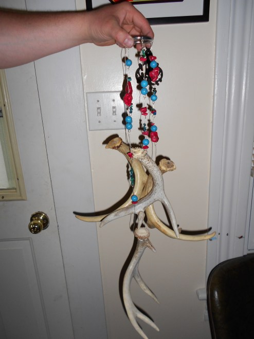 First, he drilled holes in each antler. The antlers were strung on wire. Random bright coral and turquoise beads were added to the wires. The wires were then tied to a metal ring we found a the hardware store. The ring was then strung onto loops of wire to be hung. The finishing touch was to put a dot of Gorilla glue on each wire knot to keep them in place through the wind and weather. Here’s the finished product: