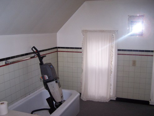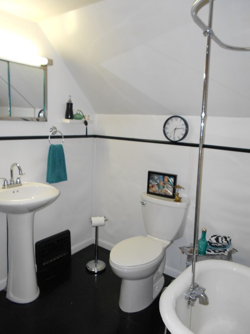 I recently bought my first home and armed with a tight budget and a big dream I set out to fix the place up. The house was built in the 20’s and plumbing was not originally indoors. The bathroom is large, but appears to be in an old bedroom or closet. There was a bathtub, but because of the slope of the roof, there was no room for a stand up shower without hitting your head. I had to get creative in order to stay within my means and also make the place functional for everyday living…