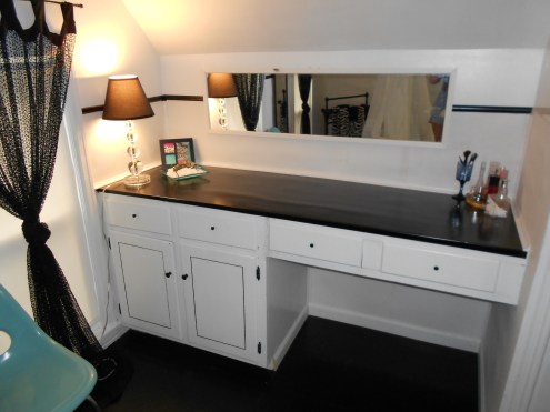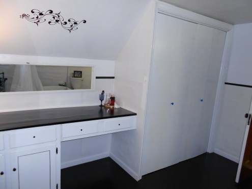 Yea, that’s right, it’s the same bathroom. Clean, functional, bright, and a bit glamorous. My own personal dressing room!