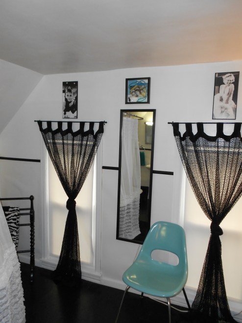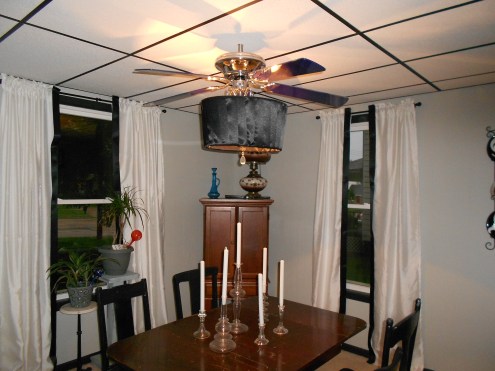 I really wanted initially to get rid of the blue ceiling fan. However, family and friends convinced me to work around it. The fan was new and it had a remote and a dimmer. They swore it would be handy. Turns out, they are right! So, I covered a large lamp shade in silky black ribbon and attached it to the fan over the light bulbs. I also hung a crystal from the pull. I think the set-up helps a lot!