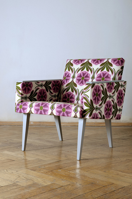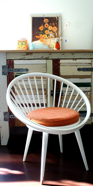 I love the round shape of this vintage chair… and also the cabinet behind it!
