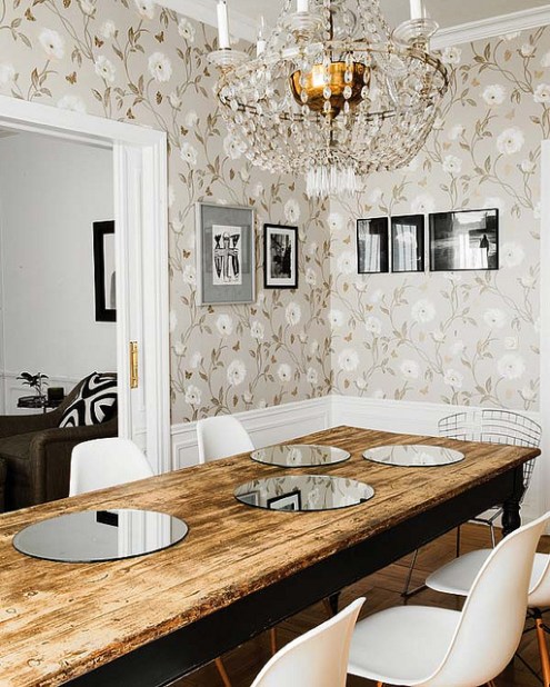 I found this dining room photo on flickr and just couldn’t resist showing you all. This room is just awesome! I love how elegant and glamorous it is, even when paired with the rustic wood table. I love the mirrors on the table; what a simple yet glam way to dress the room up. The wall paper makes the room bright, but still in the shades of gray that I love right now!