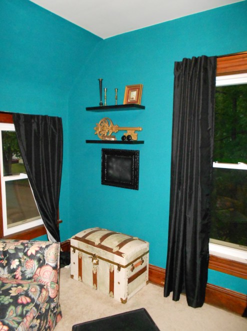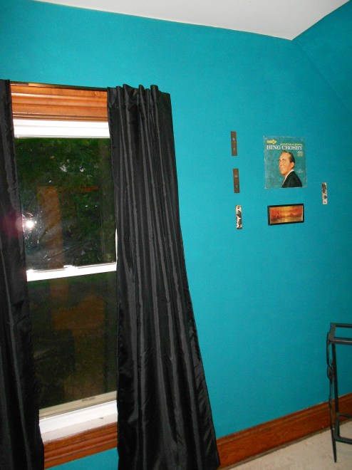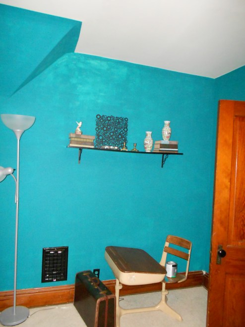 Bright, no? But, I love it and find it so cozy. Remember that couch from before I bought the house? The trunk was my birthday present a few years back and it now holds scrapbook and craft supplies. The bright flash made some of the paint look patchy, but I promise, it isn’t so. The door knobs and latch plates are from doors that were found rotting away in the garage when I moved in here. I couldn’t keep the old doors, but also couldn’t part with the the hardware. Any suggestions?