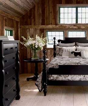 So, this Ethan Allen room that I spotted had my mind combining my love of shiny black furniture, black and white prints, and raw, rustic wood features. Here she is:
