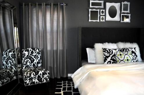 I came across this bedroom and just adore this black and white chair. No, I adore the whole glam little bedroom.