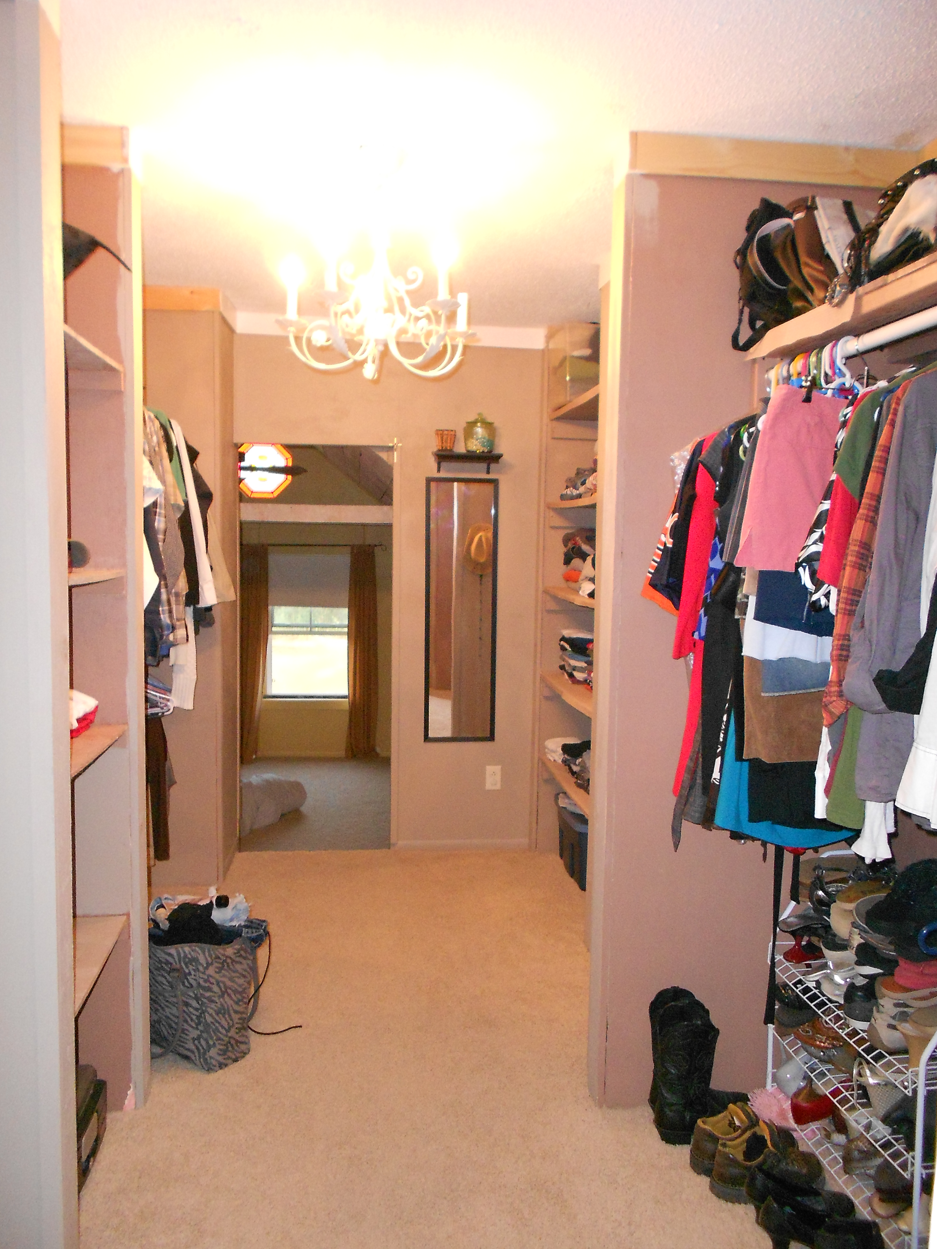 Here is a shot of my closet. Yes, I said MY. And, yes, this whooole space is the closet! Wow is right. Its like my own personal dressing room. Oh, and I might be nice and share one or two shelves. 🙂