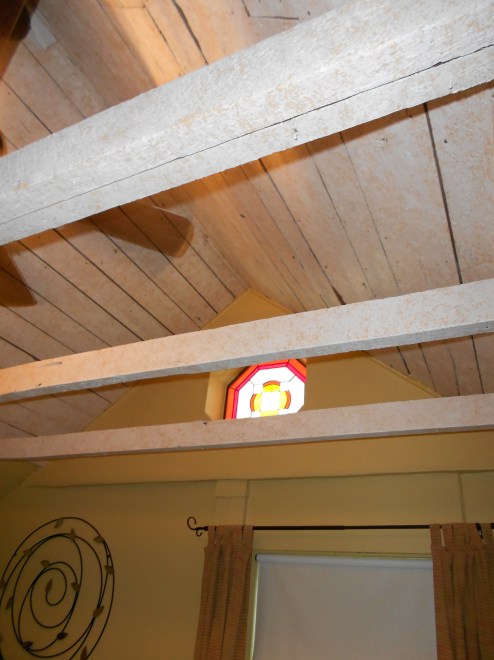 This is a peak into our bedroom. The bedroom is sunken behind the closet. The beams on the ceiling you see here are barn boards from our barn. And isn’t that little stained glass window adorable?