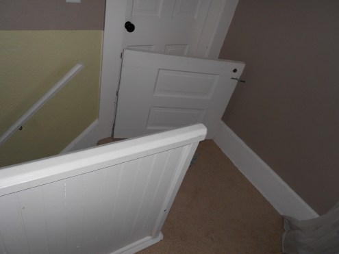This is a peak at the top landing of our stairs. This little gate was made from an old antique door. So cute. It latches with an old barn style latch. It already proves handy for keeping the dogs corralled, but will also be handy with kids someday!