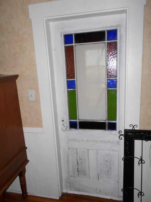 Across the other side of the dining room are two antique doors with stained glass windows. One leads to a sun room and one to a storage room. Gorgeous touches!
