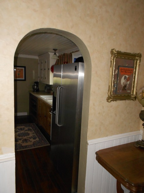 In the dining room and to the right is the kitchen. The kitchen was added on later and has a drop woods ceiling. The master sunken bedroom is above the kitchen. The kitchen has warm hardwood floors just like the dining room and living room. There is an super cute little arched doorway leading to the kitchen. And notice the antique wood wainscoting? Each room also has original crown moldings.