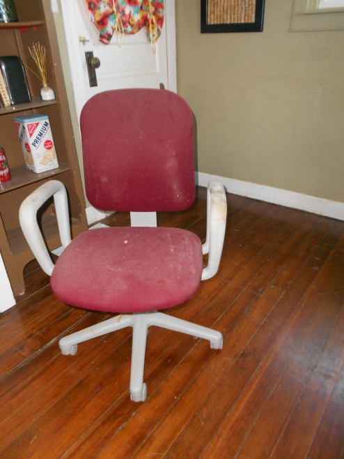 During a recent (and quick) trip down to the creepy basement to store a few boxes I noticed a computer chair with wheels! It was ugly. No other way to put it. But, it was sturdy and heavy duty, and in good shape other than the abused crudiness of it.