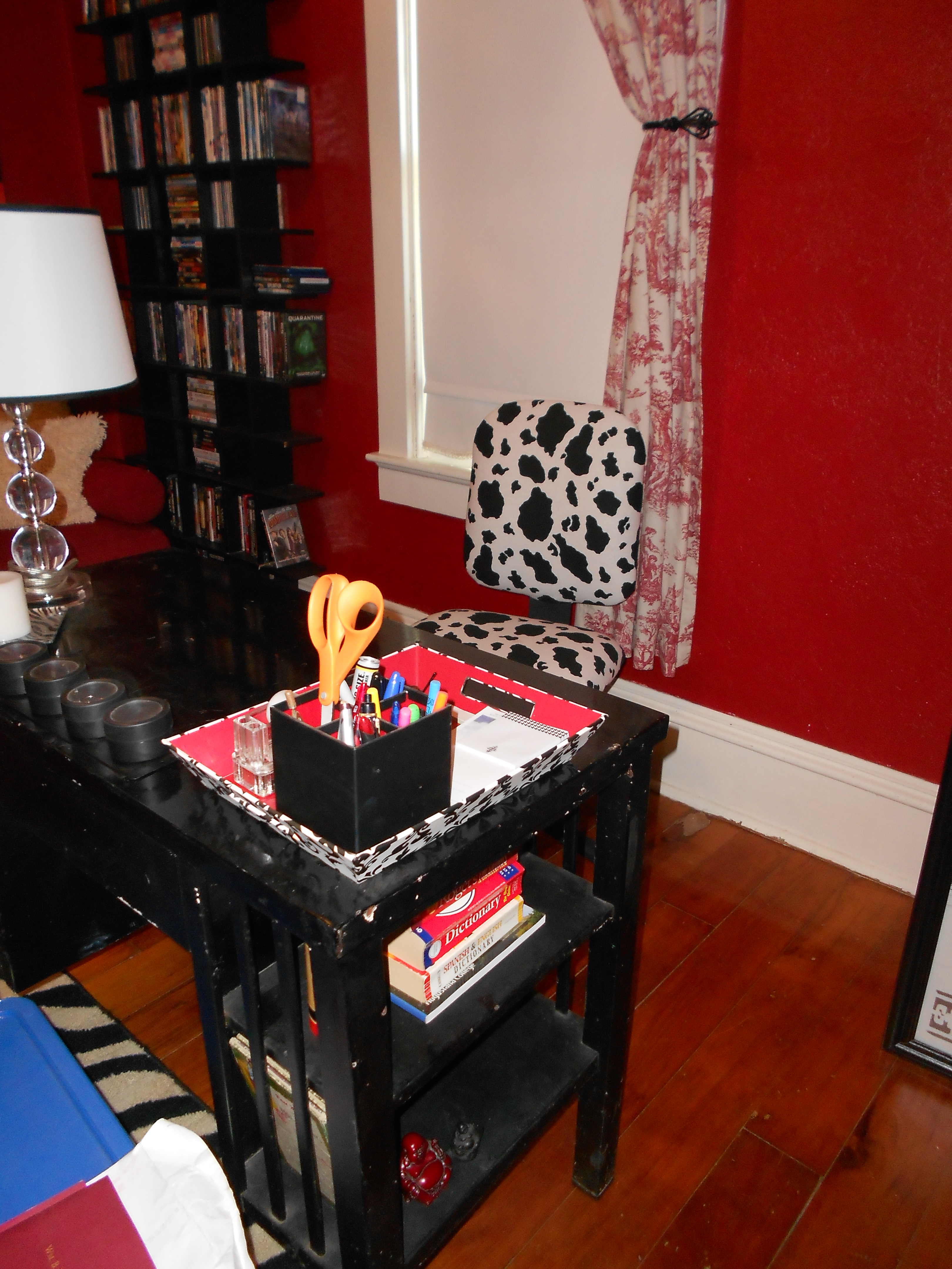 So, what do you think? I think for being a completely free project it turned out super cute and will work for us for a while, while we have zero money. Oh, and don’t worry about the BRIGHT red walls. Come winter they will no longer be so obnoxious. It is especially strong paired with a big red filing cabinet and on the other wall is a red futon and ottoman! lol.