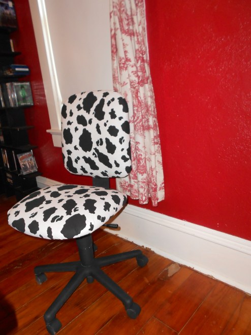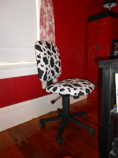 I was in an office chair conundrum at the new house. The office is large enough to hold the futon, DVD rack, desk, book shelf, and even file cabinet. But, its just not very comfortable. I loved using the comfy and gorgeous blue wingback chair in my last home office, but in this office there just isn’t enough space for a nice layout with the chair. So, the blue wingback moved to our bedroom. More pictures of that to come. Then there was no office chair. What to do?