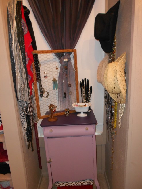 I am absolutely loving my new closet, or “dressing room,” in the new house! I am getting used to having all of my clothes, shoes, and jewelry out on display where I can easily pick outfits and use things I haven’t in a while. With the new arrangment comes, well, arranging, however. As I get settled I am slowly making changes and getting ready to paint. So, with that said, that means that I have been making some changes to my organization. If you remember my pictures of my older house, you will remember that I kept a lot of jewelry and items in an old antique metal medicine chest hung above my dresser. There was nowhere to hang it up in the closet and sitting on top of a dresser did not allow the door to open… so…