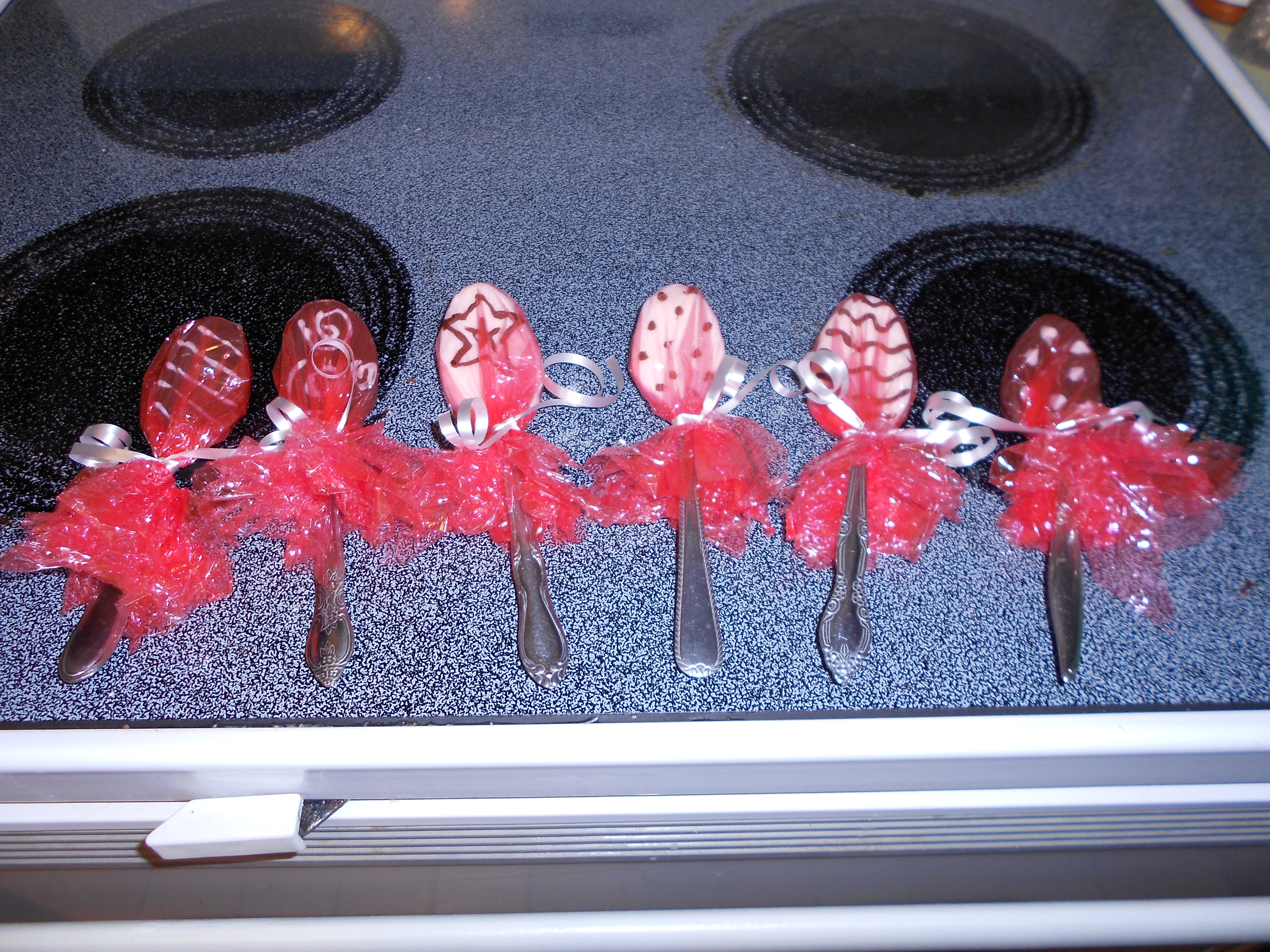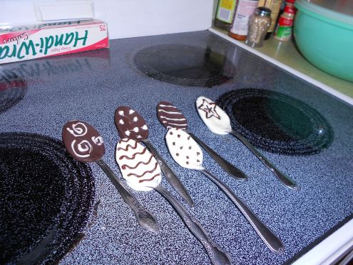 So, I decided to make a basket of hot cocoa and coffees and all the fixins. I got this idea because a while back in a magazine I saw some antique spoons coated with chocolate and given as a gift with some drinks as stirers. I started off with some vintage silver spoons and some chocolate…