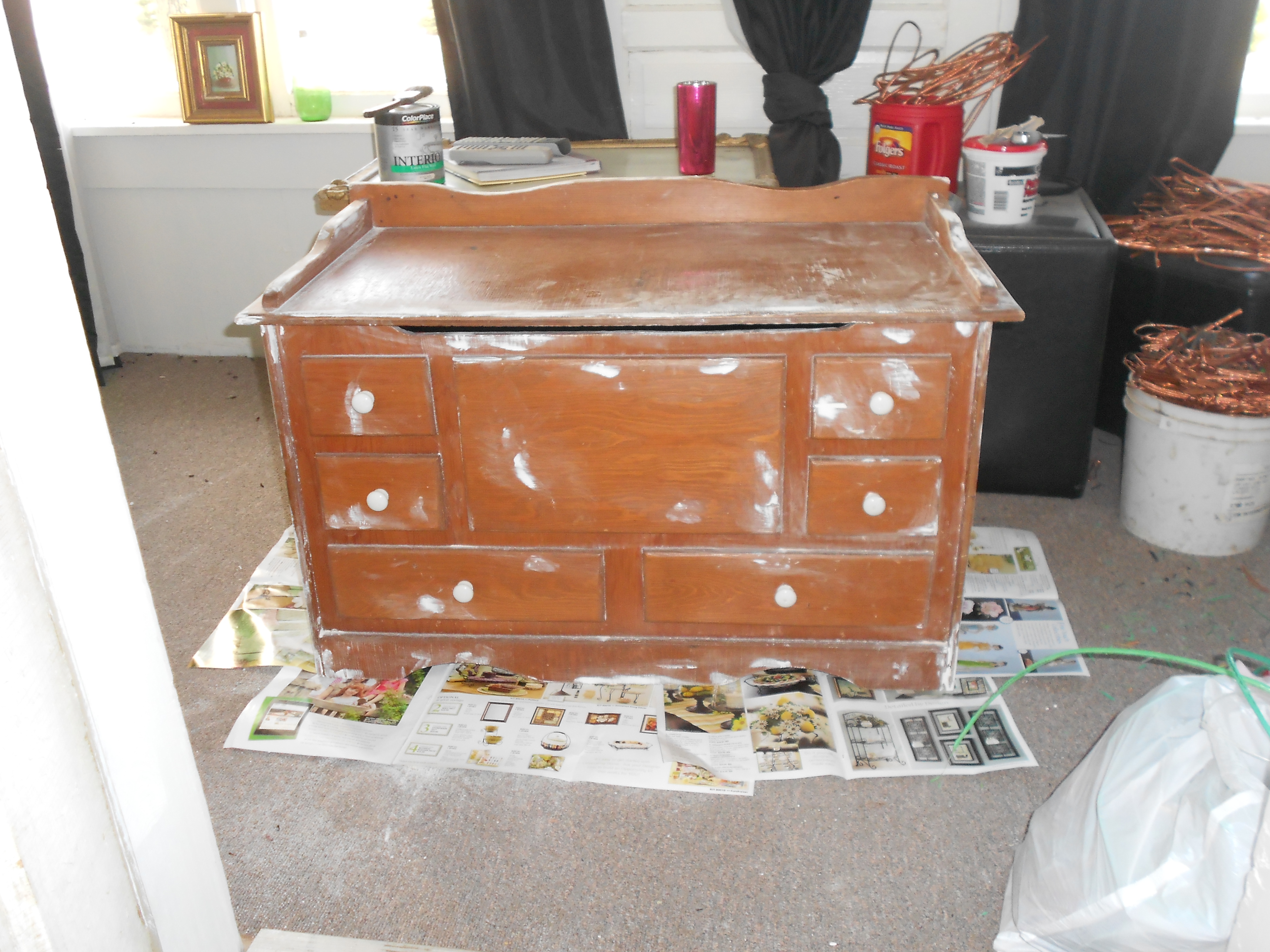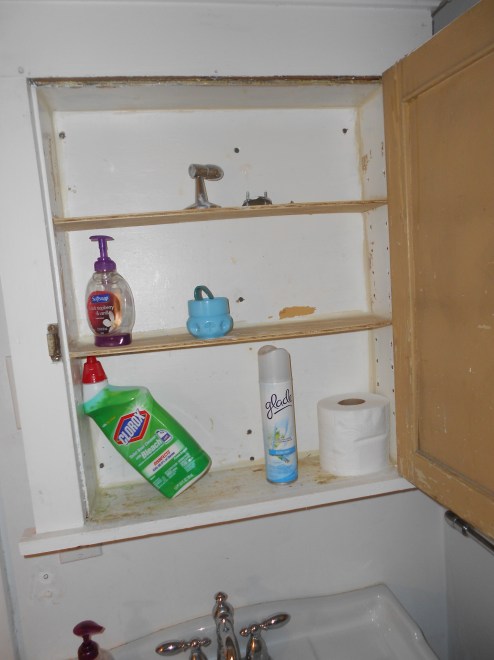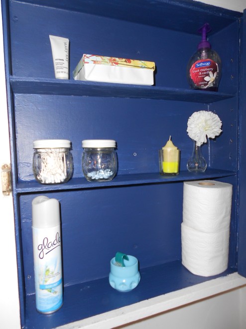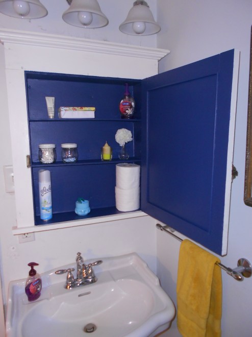 The cupboard is antique, and therefore has many bumps and cracks, so it will never be “perfect,” but now its not such an eyesore. When company is over I will not be so embarrassed to let them reach in for another roll of toilet paper or necessity!