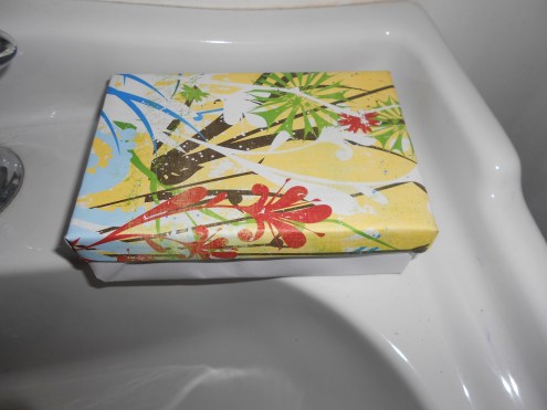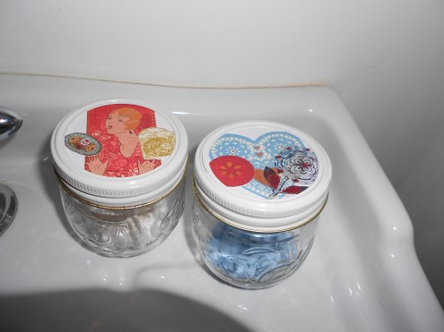 I even did a bit of decorating to the necessities in the cupboard. These antique jars got new fun lids. And a small box got a bright cover to hold small things.