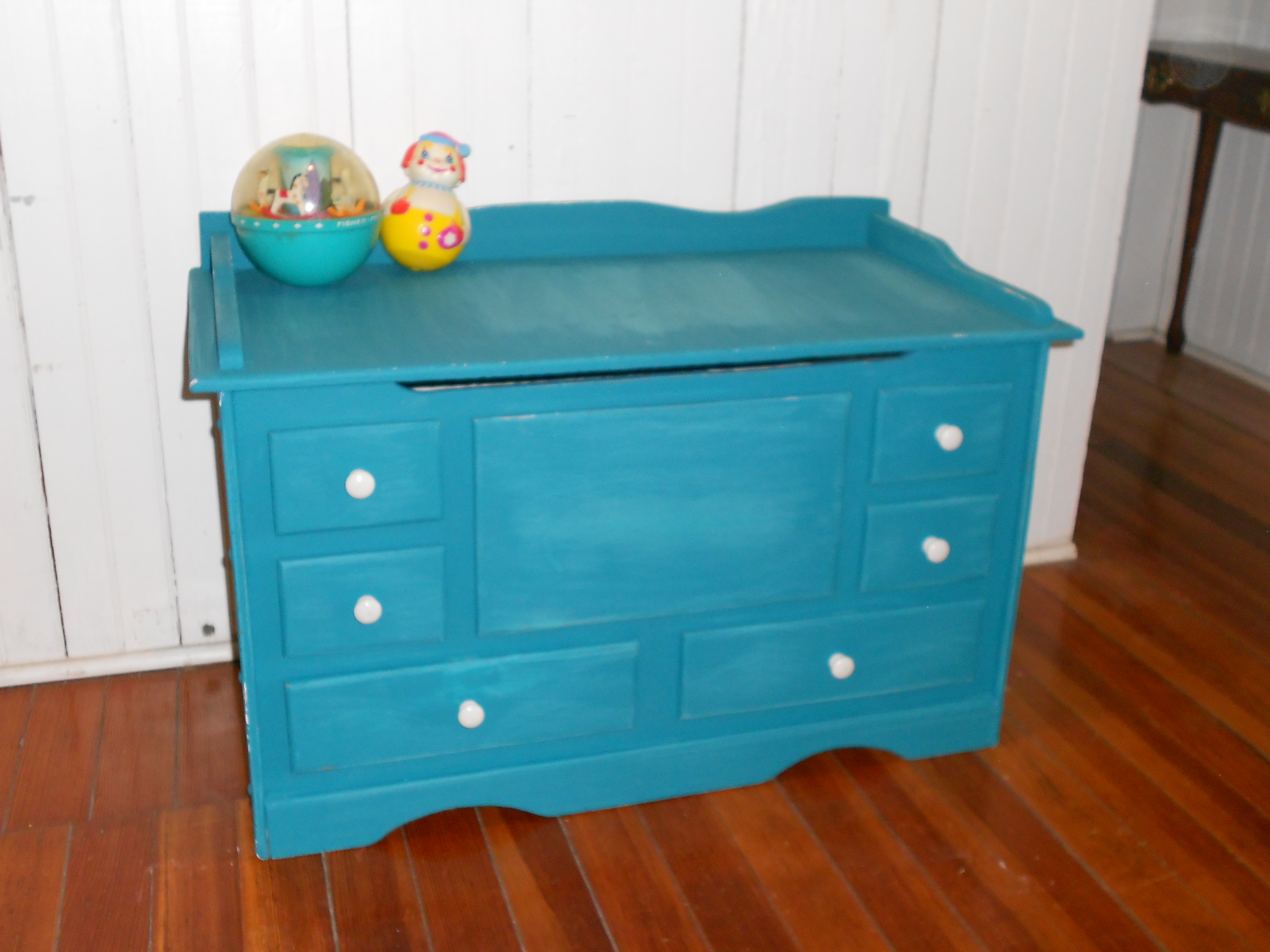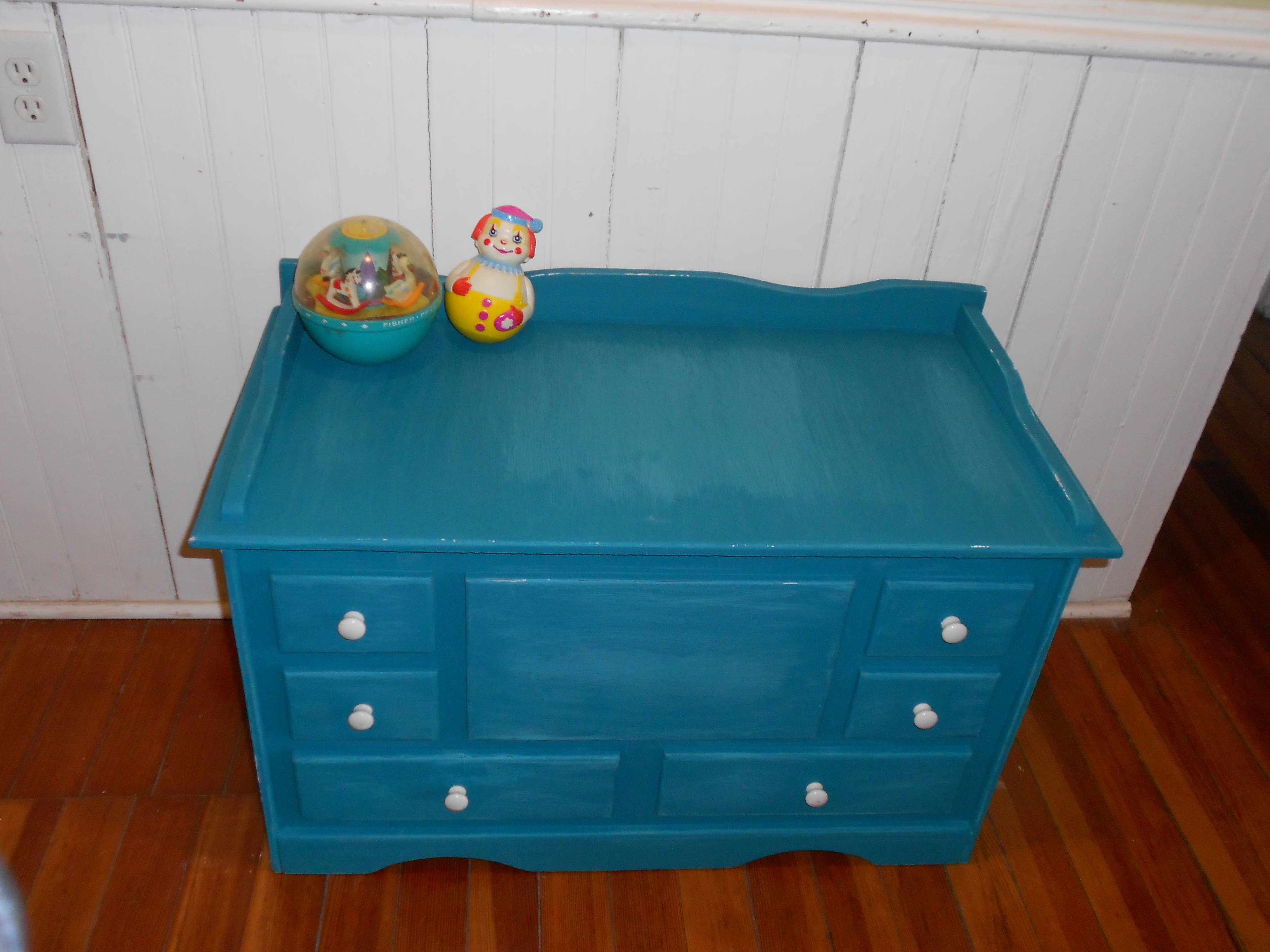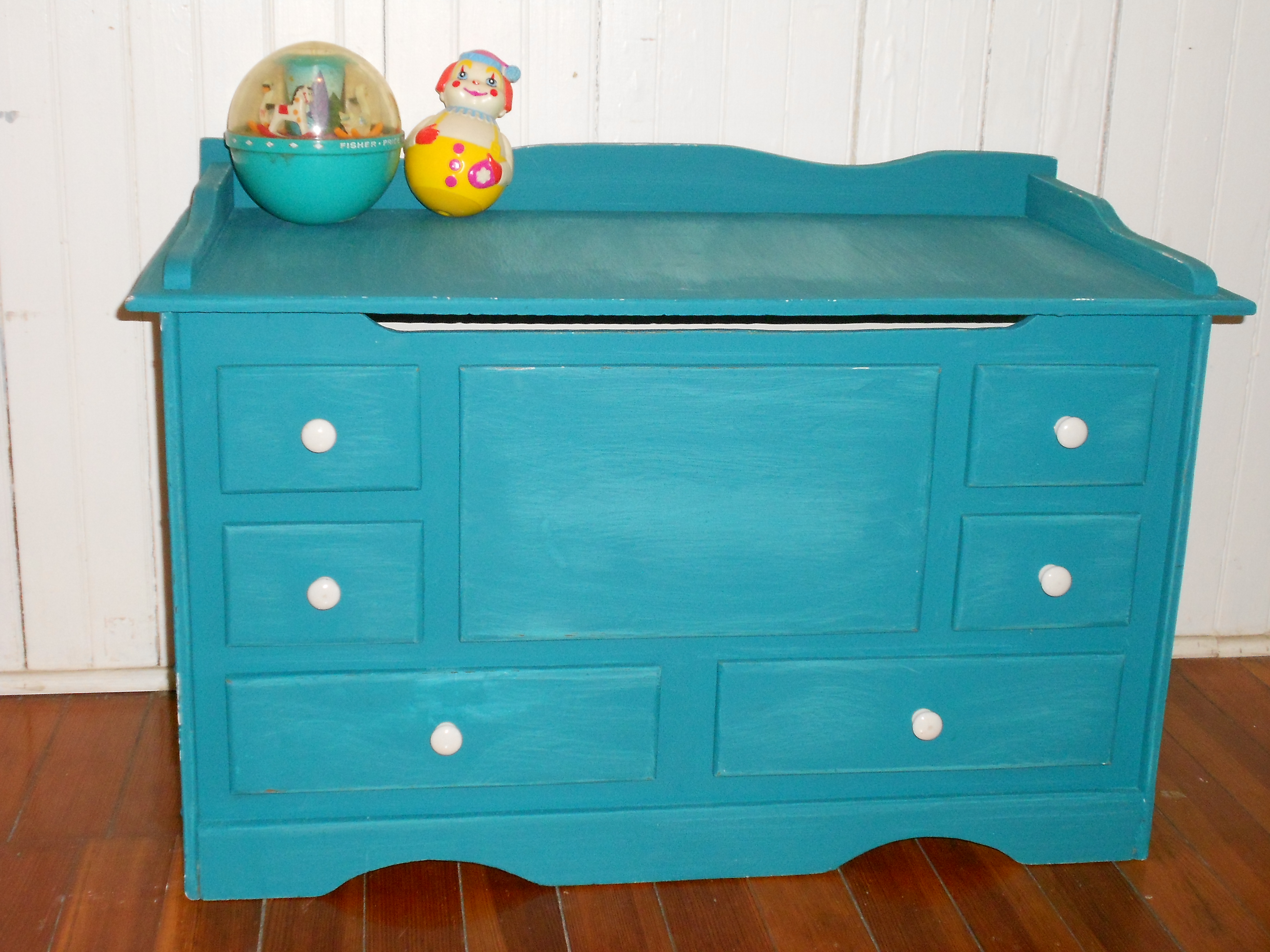 What do you think? I think it turned out super adorable. I was going to replace the handles, but the old ones are vintage ceramic and actually cleaned up nicely. I’m even tempted to keep this one! Why keep a toy box? … more news to come! 😉