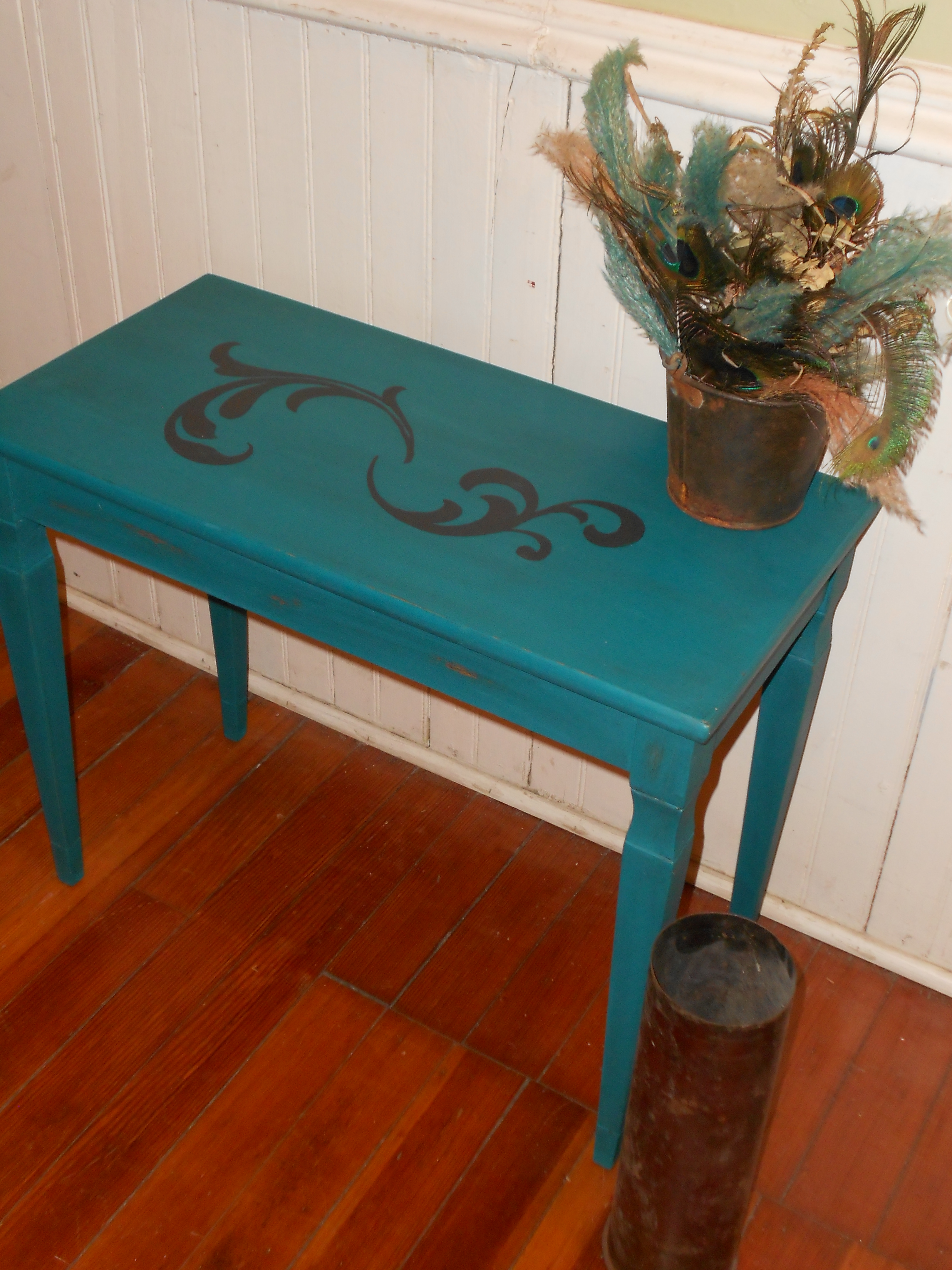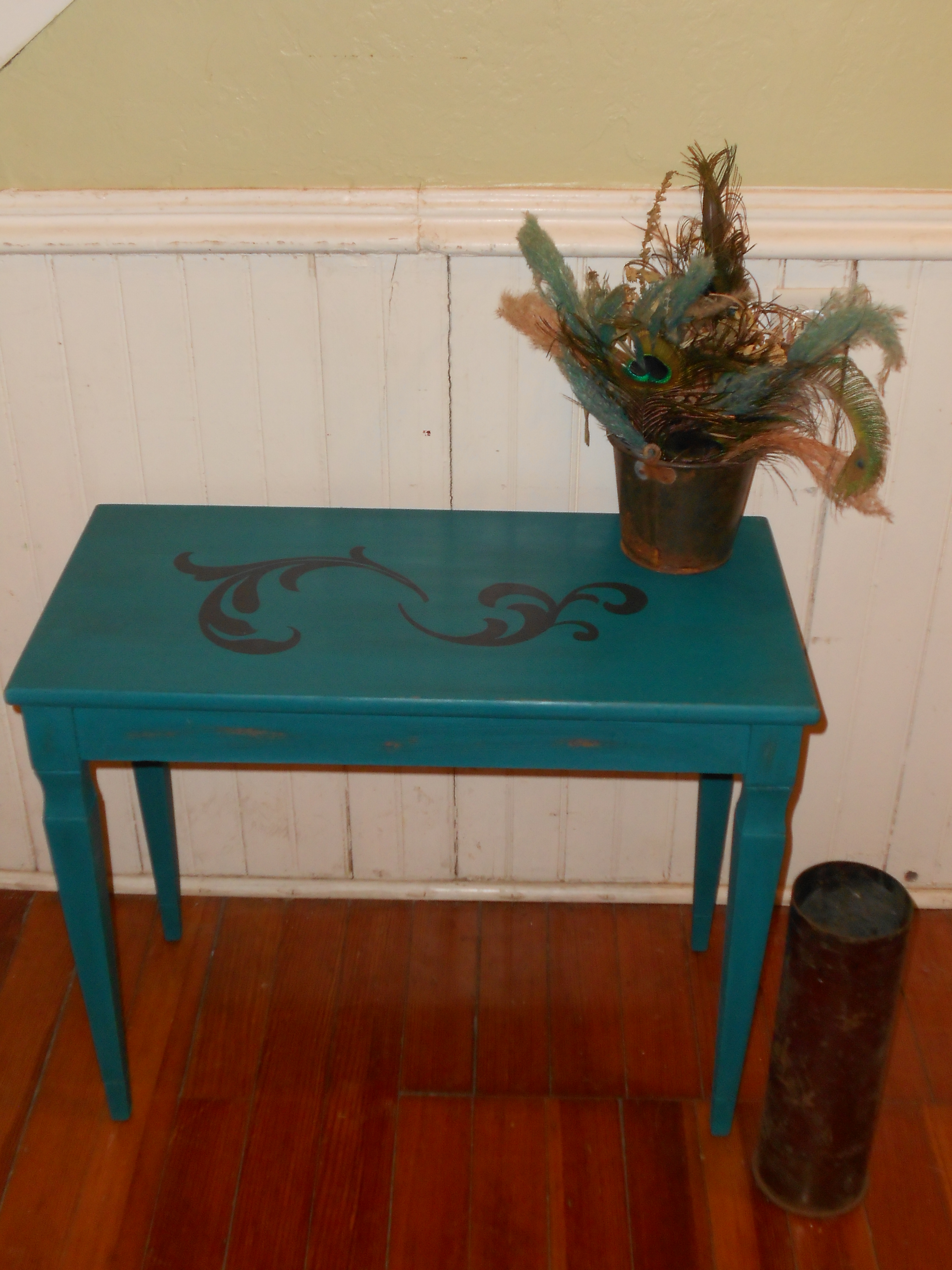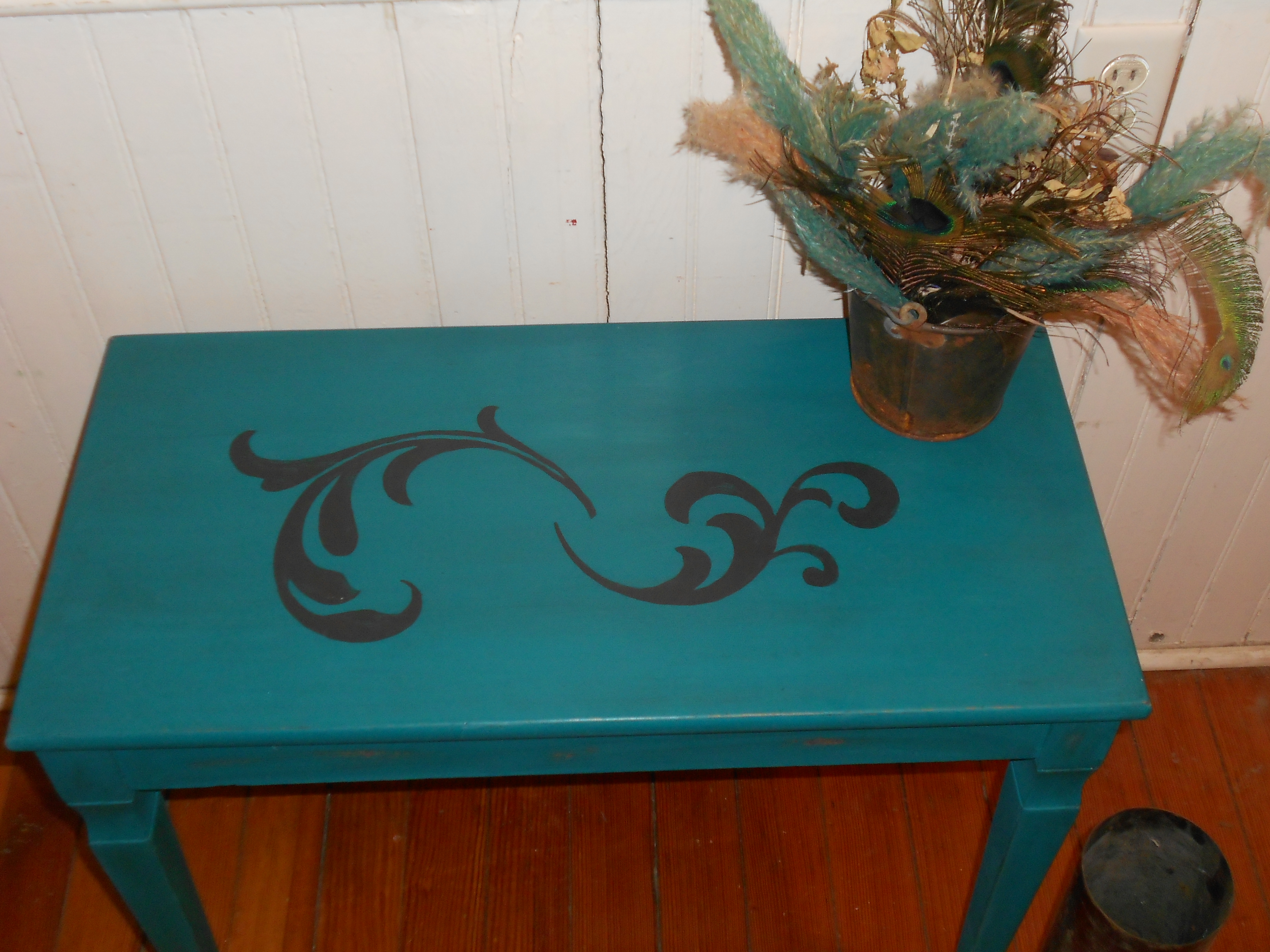 After filling, sanding, painting, stenciling, and waxing, this is what she looks like now: