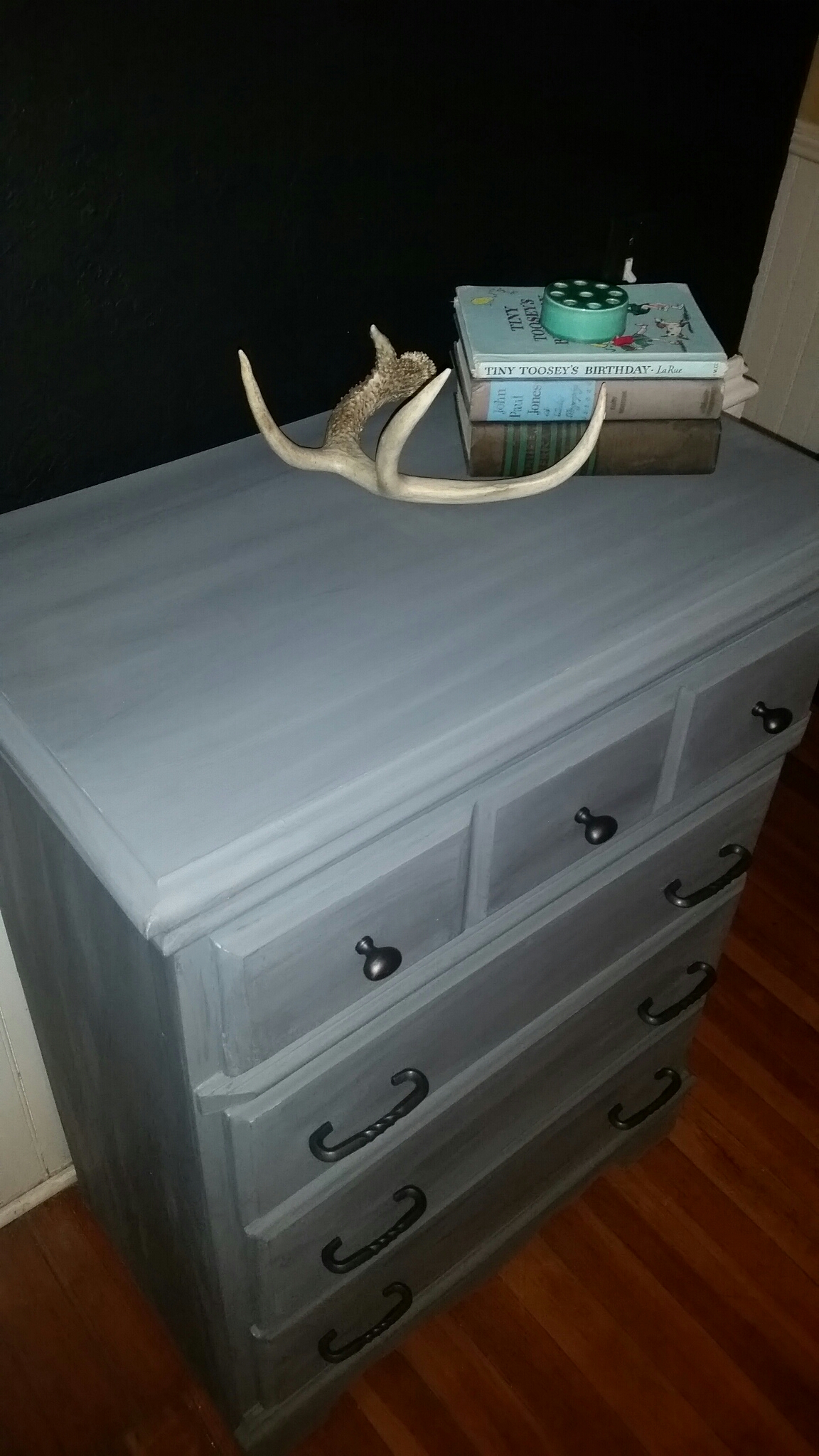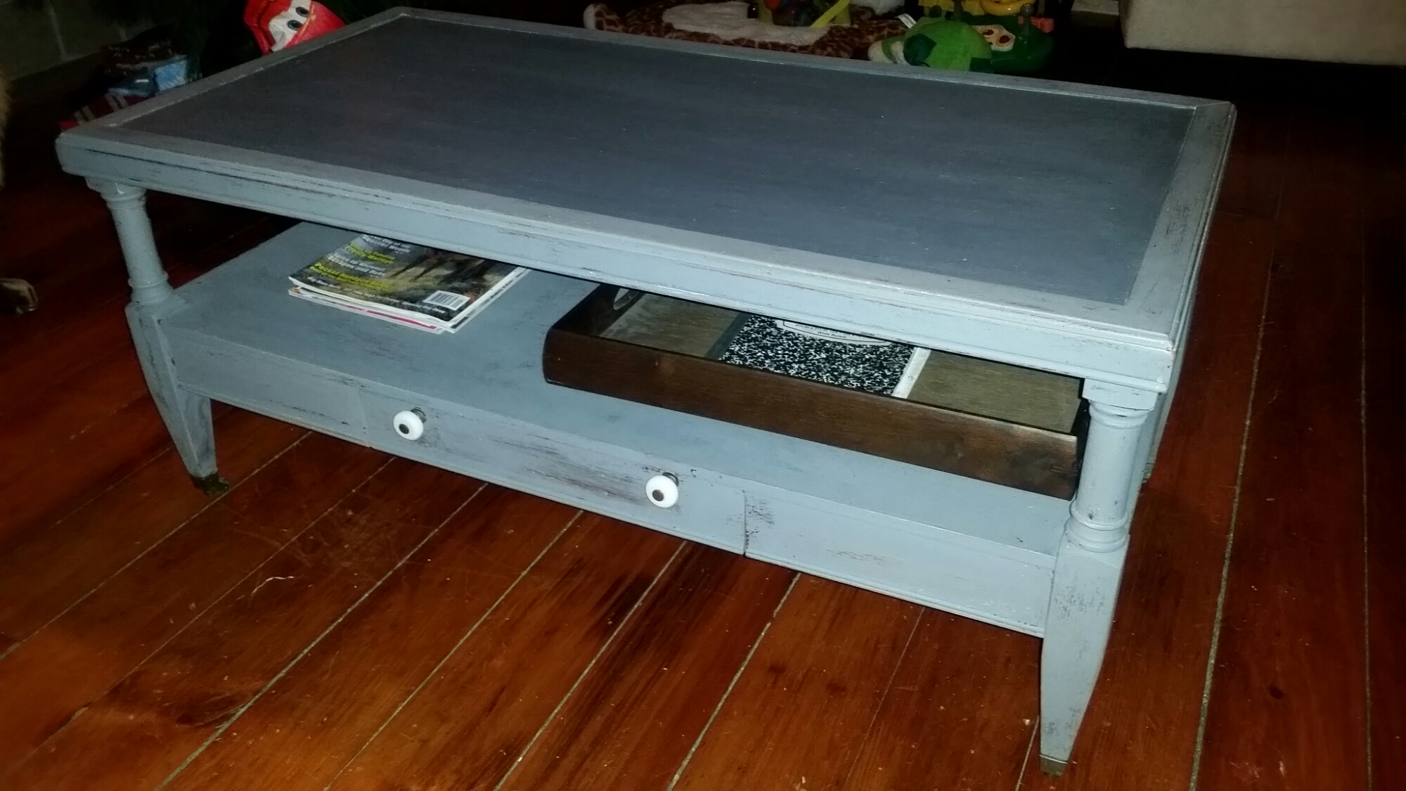 I sanded the table and then painted I’m gray (shock!) And then roughed it up. The top got a coat of a darker gray, and the whole table was finished with paste wax to protect it. I had to fix the drawer, but ended up keeping the old knobs. What do you think?