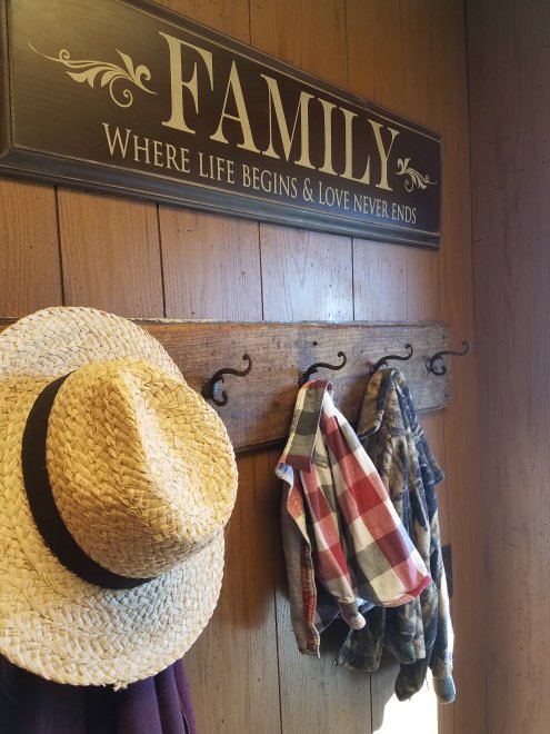 Isn’t that pretty? Just the rack here. We found a stack of nice barn boards in the back barn (there are several outbuildings on this property, one cute little guy that even used to be a milk house for selling milk- think “she shed” in the future!) We cut the board to the right width and added a sealing wax. This darkened it and brought out the rustic-ness (totally a word) without making it shiny. Then I found some antique hooks hung all around the walls of a closet room (which I plan to be a second bathrom) upstairs. We heated the hooks up on the stove, in hopes of burning off any extra rust so that they wouldn’t run anything off onto the coats, but helped me avoid painting them a fresh black, which seemed to “new” for this project. We picked 5 hooks, one for each family member. You get 2 necessary items hung, ie one coat and one bag, or whatever. The rest goes into the closet. Mama hates clutter. And this is what we ended up with.