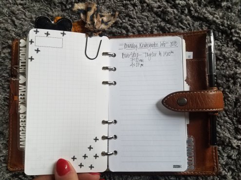 Next I’ve got some lists. I keep some blank pages of this pretty cross paper too, for when I think of something I need to list. This is sometimes details of an event I might be planning, or right now I jot baby milestones and notes for his eventual baby album. So handy to do this on the run! My other lists include products I love (to buy again), products I want to try, Disney Classics movies (to mark off what we have to collect them), school info (also below) and kid info like sizes. Also shown below I’ve got some ToDo paper turned into a list of deposits by renter has made. Things like this help me jot and reference while out on the run. These lists change and get added to as needed as well.