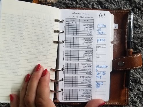 I have a printed off sheet from Simply Clean showing a cleaning schedule. I don’t stick to it, but at first when I started to do a cleaning schedule it helped to see it in front of me. Now it’s there to reference. This is the kind of thing you could always add or remove or change too!
