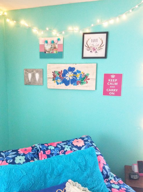 This was the mint turquoise color she had picked for her bedroom at our previous house and she was really wanting it again. It is super pretty, and not quite as bright in person. She also loves pink and peach. I added some navy to calm and tie the colors in and some gold hints for glam factor. Sounds busy. Totally goes.