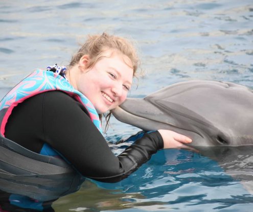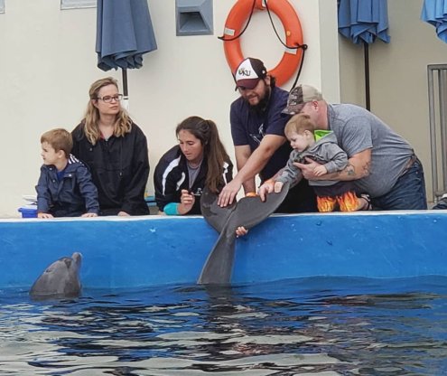 Yes, we danced with the dolphins! 🤩 This dolphin is Dazzle and she was a sweetheart. We learned a lot about her and dolphins in general. You can choose tickets to swim with the dolphins or tickets to meet and greet with them (pet them!), like the youngest and dad did.