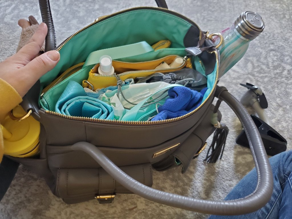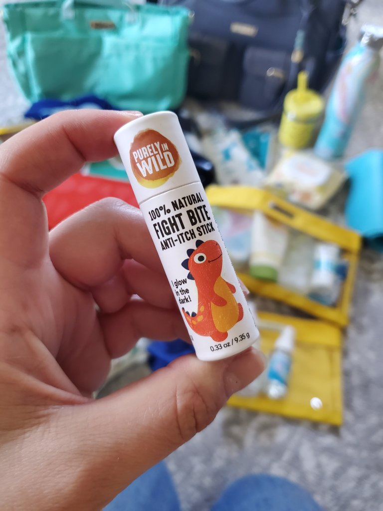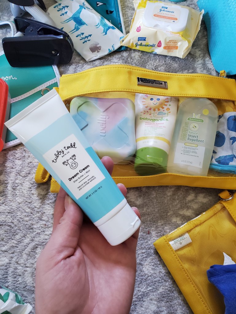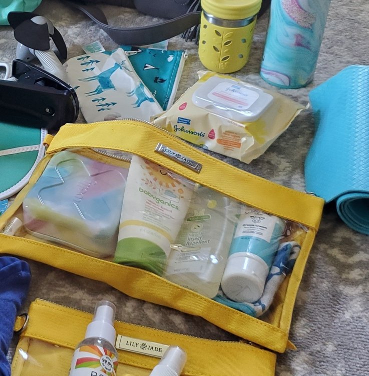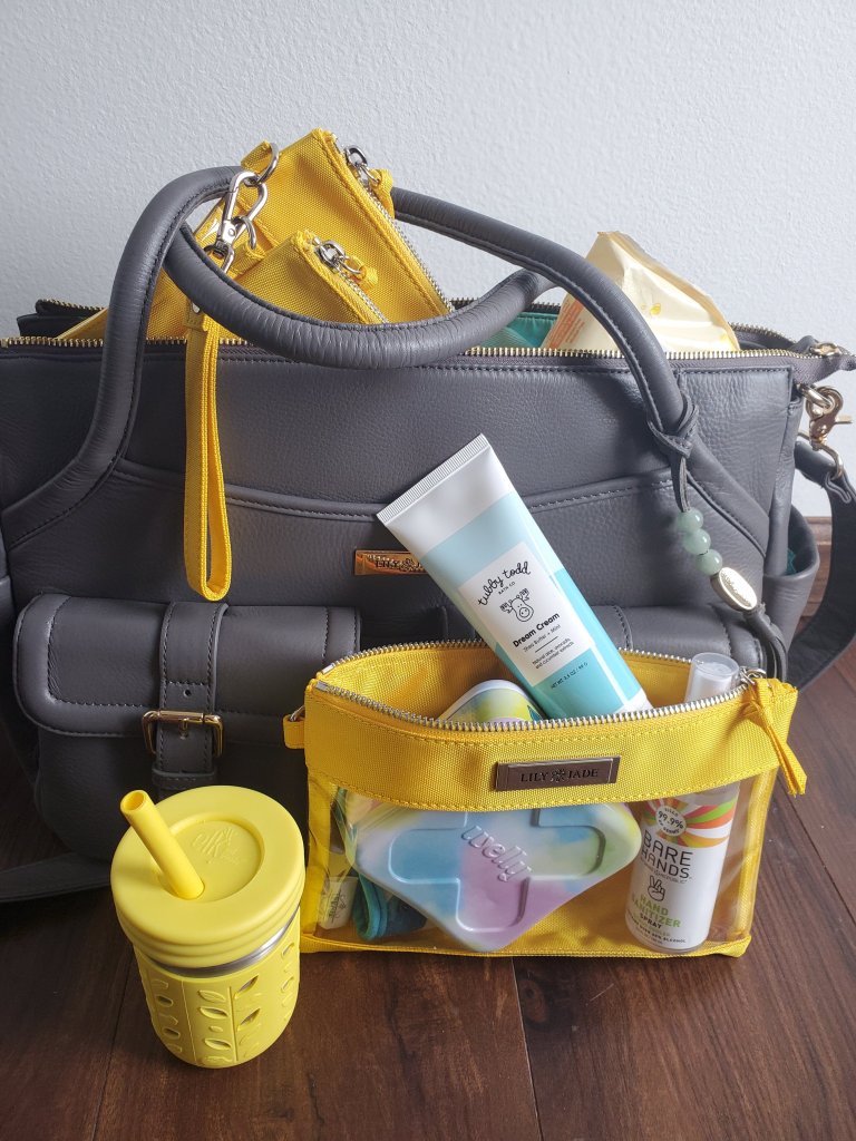Our Lily Jade diaper bags are our favorite and their packing cases make great spots for all the things we need. I like to pack them by category. I even use one pouch for “mom stuff.” Think lip gloss, lotion, Tylenol, etc.