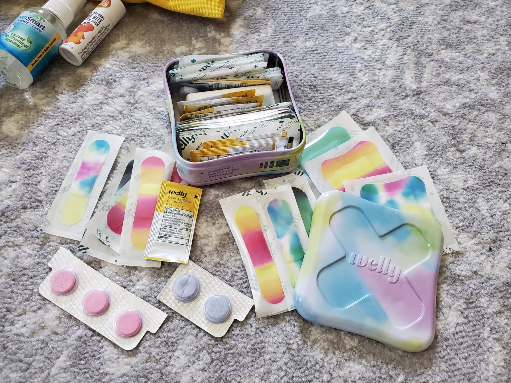 Bandaids and medicine are a must! These metal kits from Welly come loaded and are so handy. I buy the bandaid kit and med kit and swap half and half to put in places like the diaper bag, car, camper, etc. Their meds include stomach soother, fever relief, and allergy relief. And are rated for ages 2 and over. So handy!!