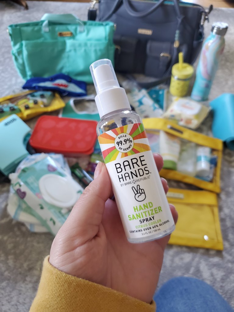 I even throw the mini bottle in my diaper bag to spray down items as we go (think shopping cart handles!)