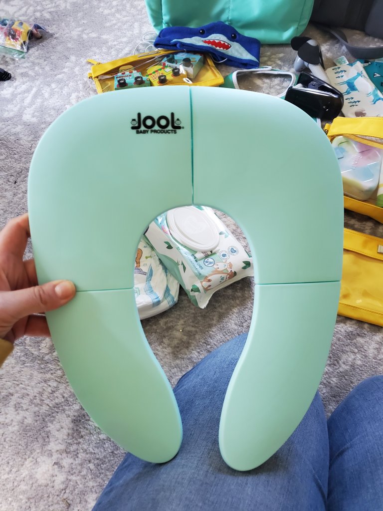 First, diapers, wipes, changing pad and extra change of clothes. Even if you toddler is potty training or has learned, these are super handy for emergencies. Believe me, I know. Also, a folding potty seat. Game changer. (This changing pad is so nice, and super wipeable/cleanable! )