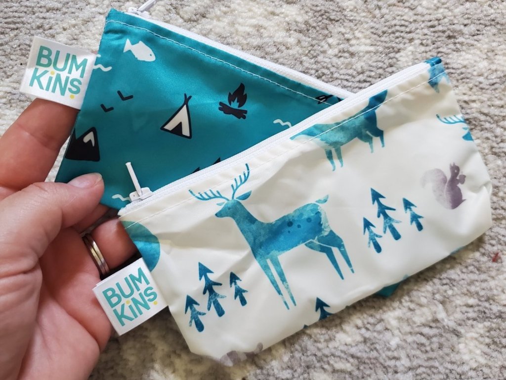I also always add some Bumkins pouches. Handy to pack snacks or to stash things on the go. We’ve even filled one with shells and treasures on an adventure before. 🤣