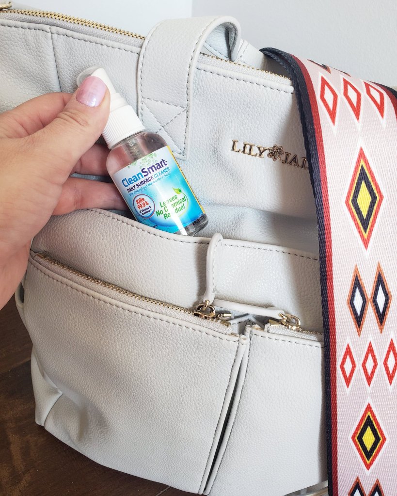 I also always add a mini CleanSmart spray. This guy disinfects surfaces with just a spray and is safe for the kiddos! CleanSmart and sanitizer both go in an easily accessible side pocket, not a pouch, for quick grabbing.