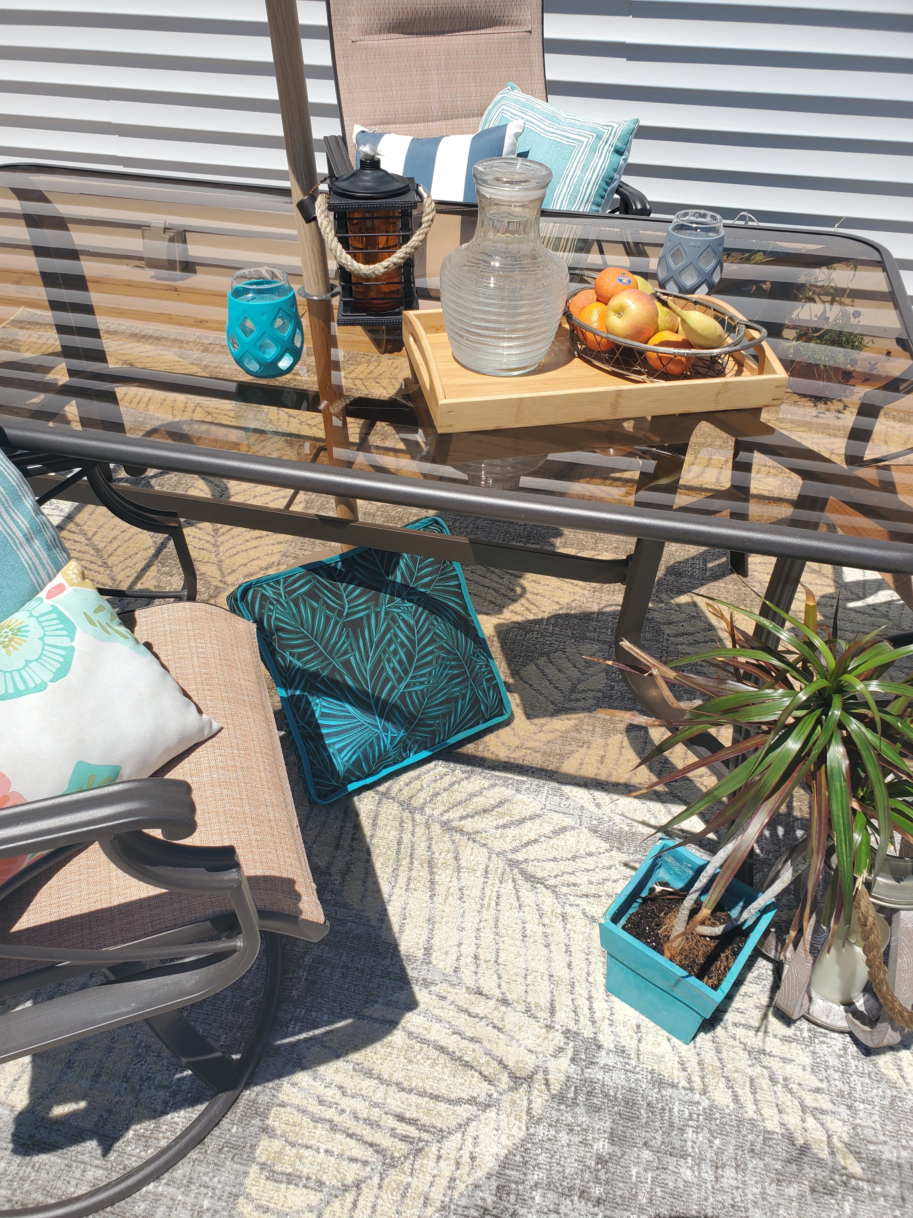 Some cushions and Walmart and Dollar General, but old, and the two darker green are new from Target Dollar Spot. Scotch Guard them to keep them longer, and I take in or put in a deck box when weather is bad. 😉