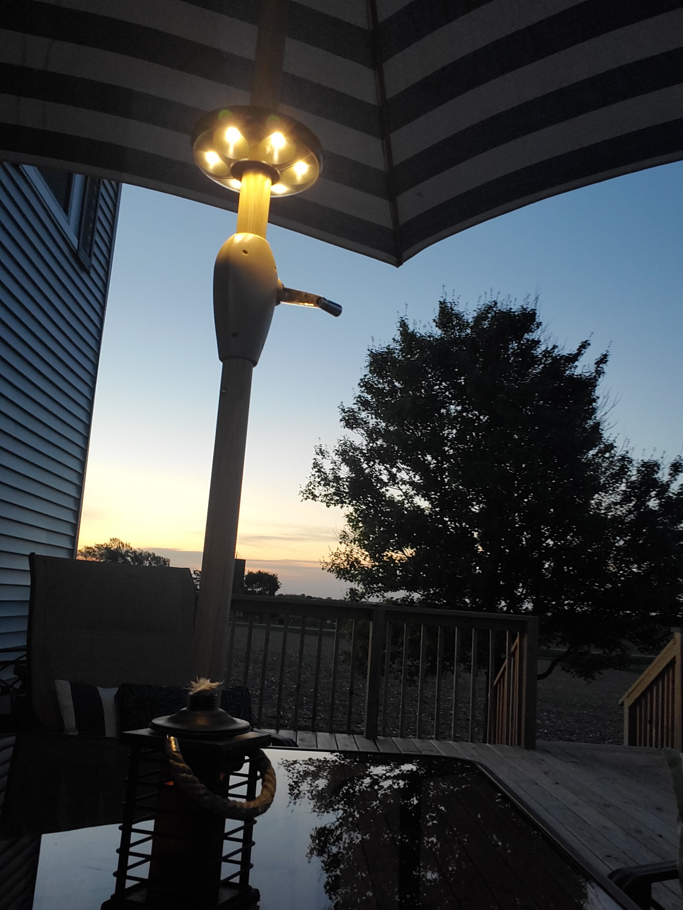 One more cozy add is lighting and sound. This can be super simple too. My lanterns are all inexpensive and have solar lights in them. We also added this umbrella light from Brilliant Evolution recently and it adds such a beautiful glow in the evening! You can use code JESSICA15OFF on their lighting too!